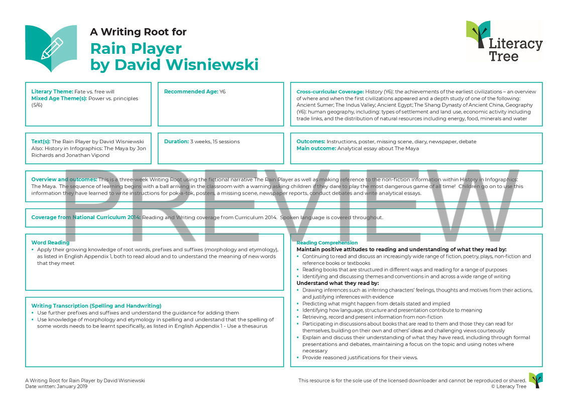This is a three-week Writing Root using the fictional narrative The Rain Player as well as making reference to the non-fiction information within History in Infographics: The Maya. The sequence of learning begins with a ball arriving in the classroom with a warning asking children if they dare to play the most dangerous game of all time! Children go on to use this information they have learned to write instructions for pok-a-tok, posters, a missing scene, newspaper reports, conduct debates and write analytical essays.