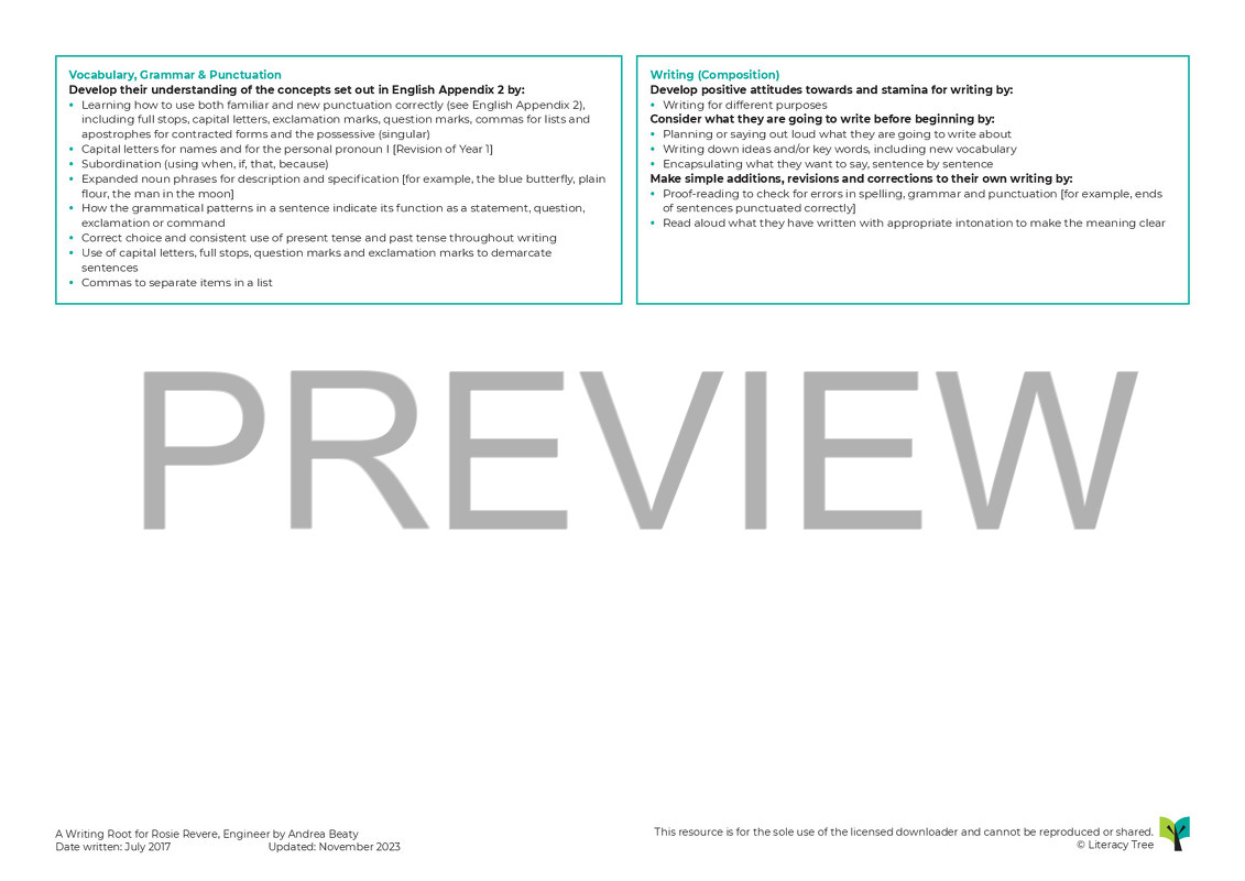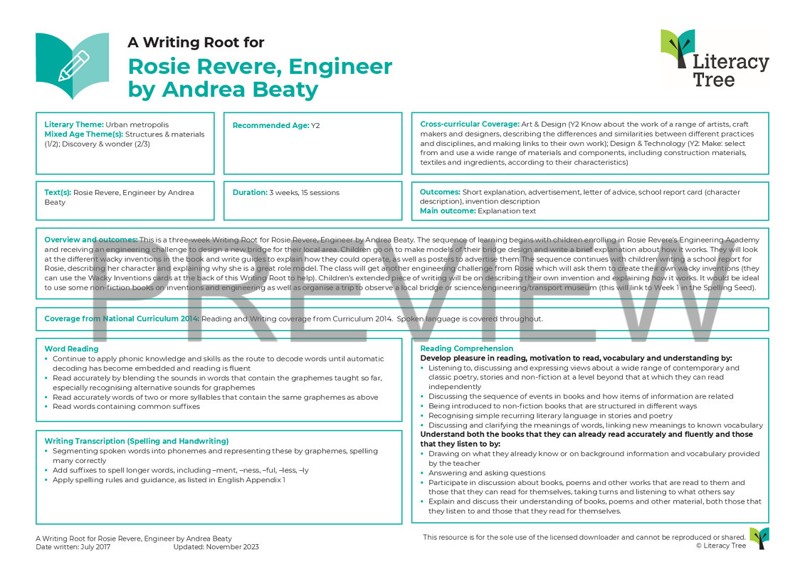 This updated version of the Writing Root for Rosie Revere, Engineer was produced in November 2023. If you have used the previous version in the past and would like a copy of the resource, please email us at info@literacytree.com.