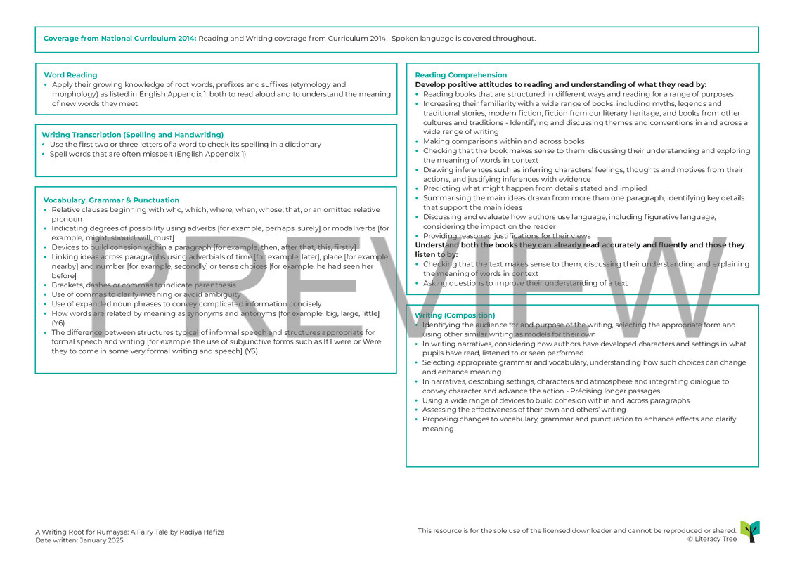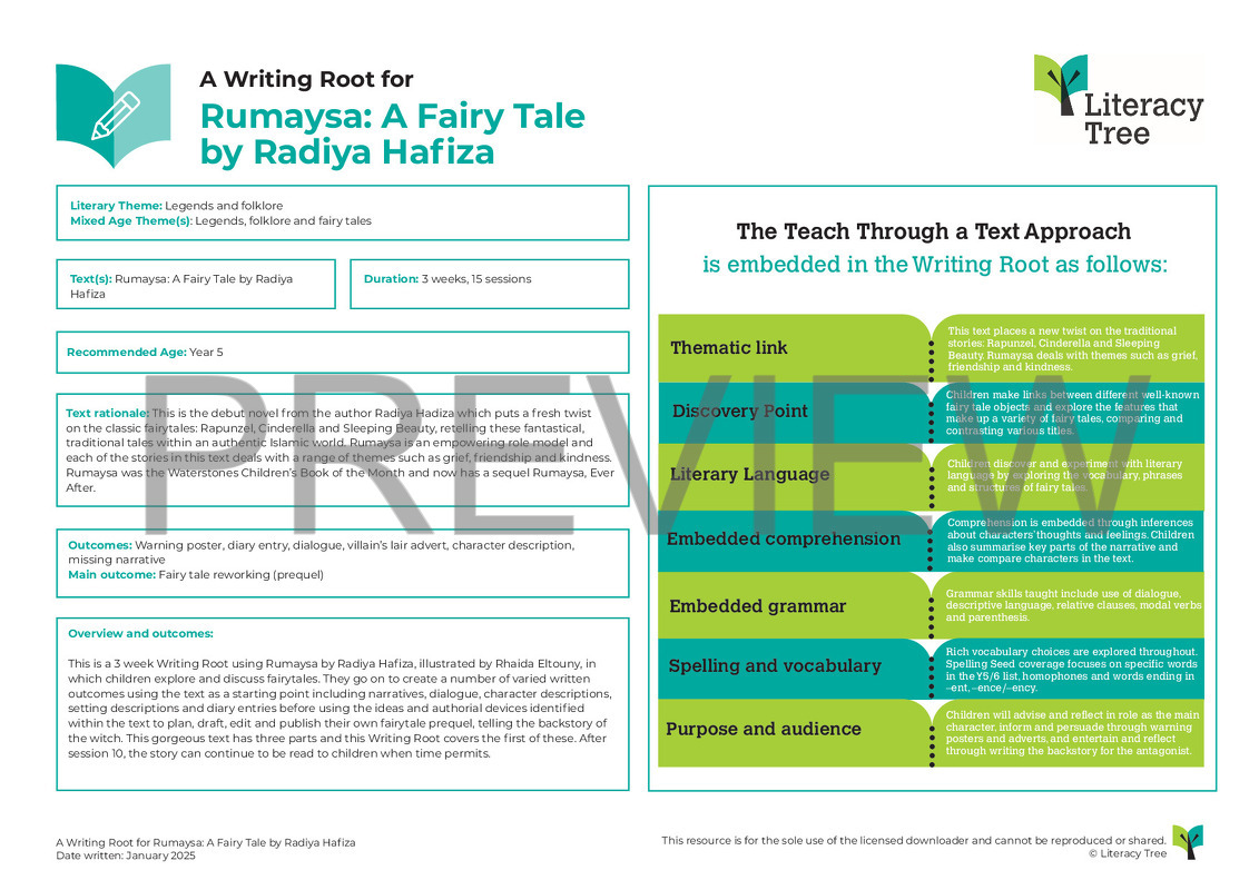This is a 3 week Writing Root using Rumaysa by Radiya Hafiza, illustrated by Rhaida Eltouny, in which children explore and discuss fairytales. They go on to create a number of varied written outcomes using the text as a starting point including narratives, dialogue, character descriptions, setting descriptions and diary entries before using the ideas and authorial devices identified within the text to plan, draft, edit and publish their own fairytale prequel, telling the backstory of the witch. This gorgeous text has three parts and this Writing Root covers the first of these. After session 10, the story can continue to be read to children when time permits.