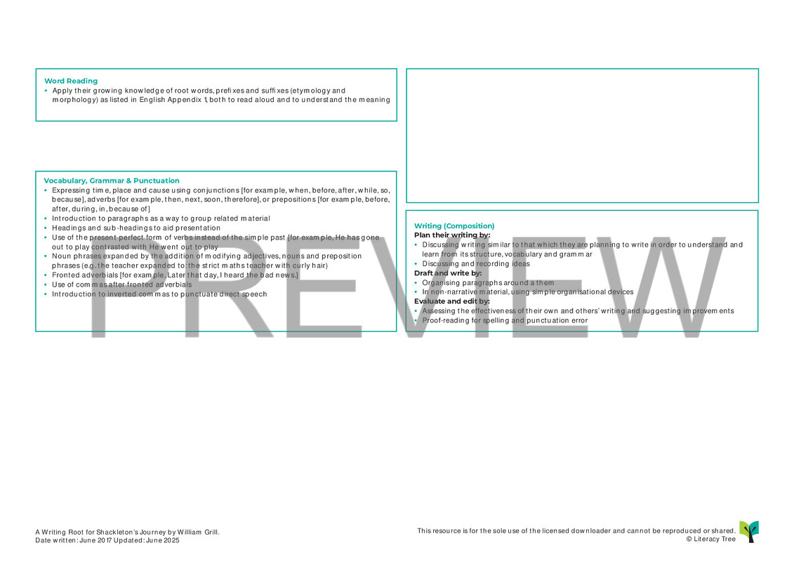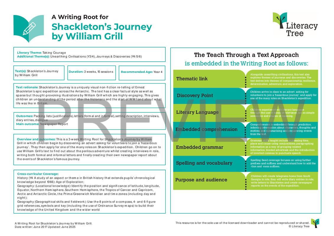 This is a three-week Writing Root for Shackleton’s Journey by William Grill in which children begin by discovering an advert asking for volunteers to join a ‘hazardous journey’. They then apply for one of the many roles on Shackleton’s expedition. Children then go on to use William Grill’s text to find out about the perilous adventure whilst creating interviews in role, writing both formal and informal letters and finally creating their own newspaper report about the events of Shackleton’s famous journey.
