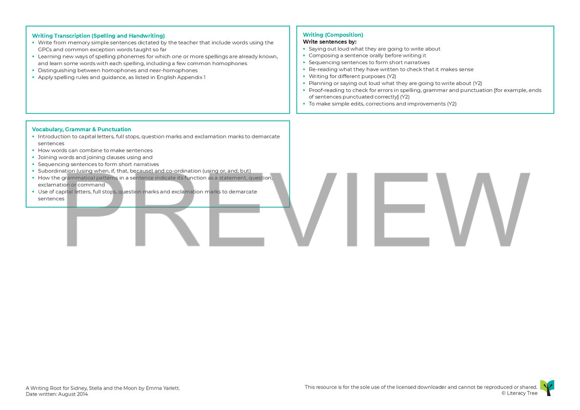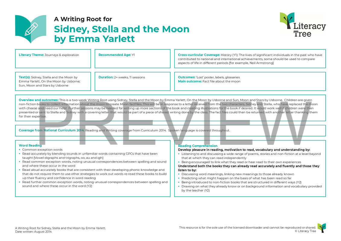 This is a 2+ week Writing Root using Sidney, Stella and the Moon by Emma Yarlett, On the Moon by Usborne and Sun, Moon and Stars by Usborne. Children are given non-fiction books to collect information about the moon to create Moon factfiles. This will be in response to a letter received from the two characters, Sidney and Stella, who have replaced the moon with cheese and need our help! Further sessions may be needed for writing up more sections of the book and creating illustrations for the book if desired. It would work well if children were then presented or sent to Stella and Sidney with a covering letter that would be part of a piece of shared writing done by the class. The fact files could then be returned with another letter thanking them for their expertise.