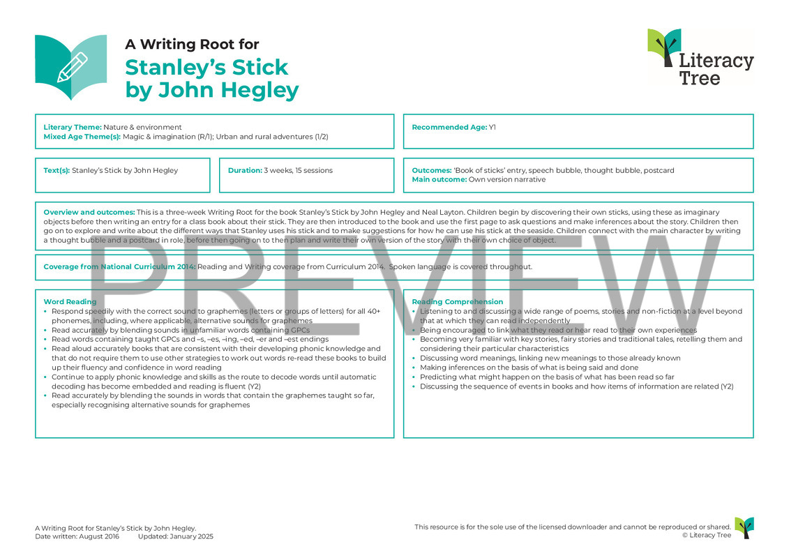 This is a three-week Writing Root for the book Stanley’s Stick by John Hegley and Neal Layton. Children begin by discovering their own sticks, using these as imaginary objects before then writing an entry for a class book about their stick. They are then introduced to the book and use the first page to ask questions and make inferences about the story. Children then go on to explore and write about the different ways that Stanley uses his stick and to make suggestions for how he can use his stick at the seaside. Children connect with the main character by writing a thought bubble and a postcard in role, before then going on to then plan and write their own version of the story with their own choice of object.