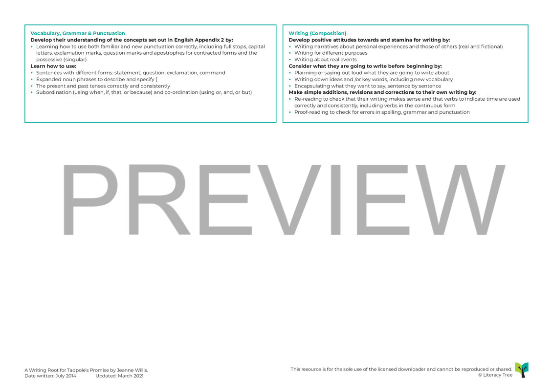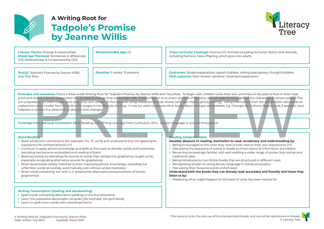 This is a three-week Writing Root for Tadpole’s Promise by Jeanne Willis and Tony Ross. To begin with, children write their own promises on lily pads to float in their class pond and record a simple explanation of a process of change they are familiar with. Children go on to re-enact sections of the story and consider the thoughts of the characters at certain points. This is in preparation for them to plan and write their own version of the narrative using characters of their choice (who also meet a grizzly ending!). Using information from the text children also create an explanation text in leaflet form to outline the stages in the lifecycle of a frog. It may be useful to ensure other books about changes are available, e.g. Changes by Anthony Browne and, if possible, have tadpoles in or near the classroom to observe their changes.