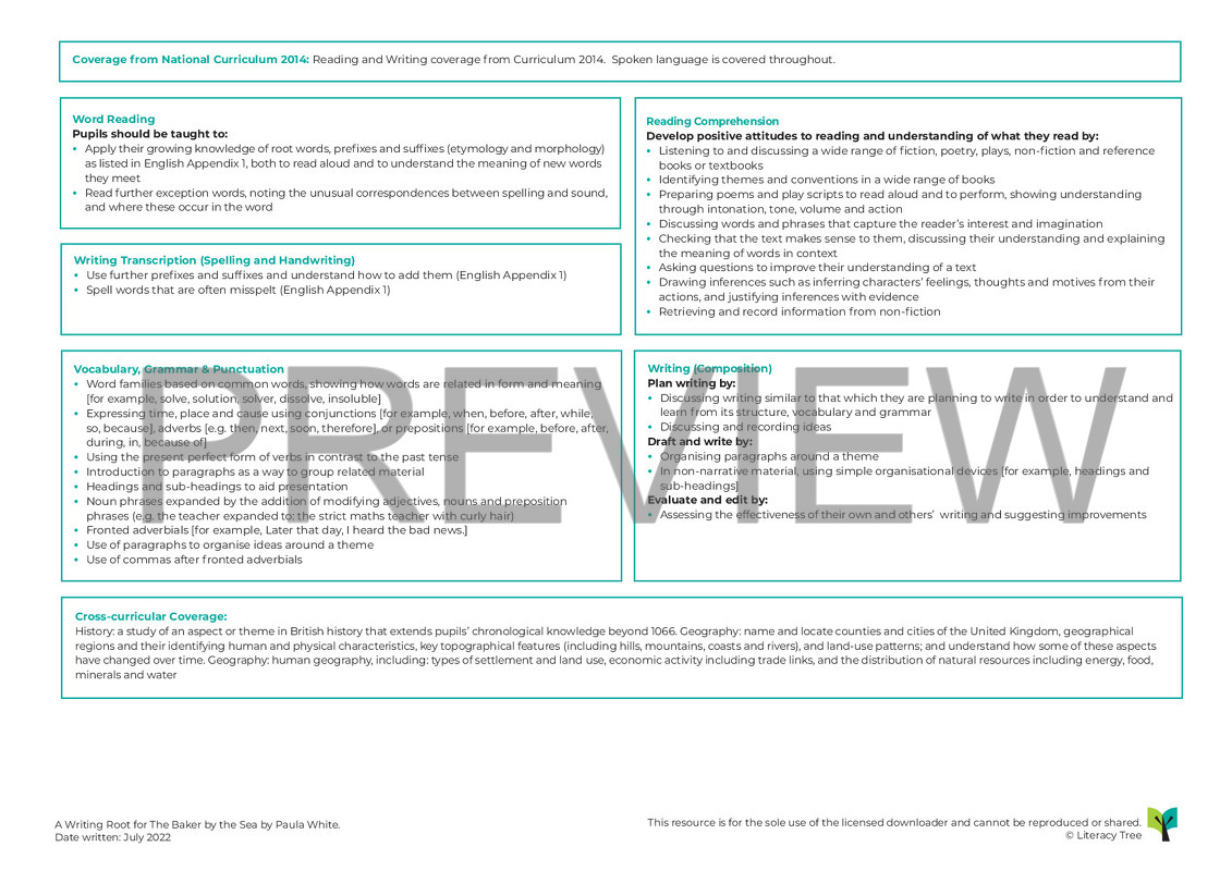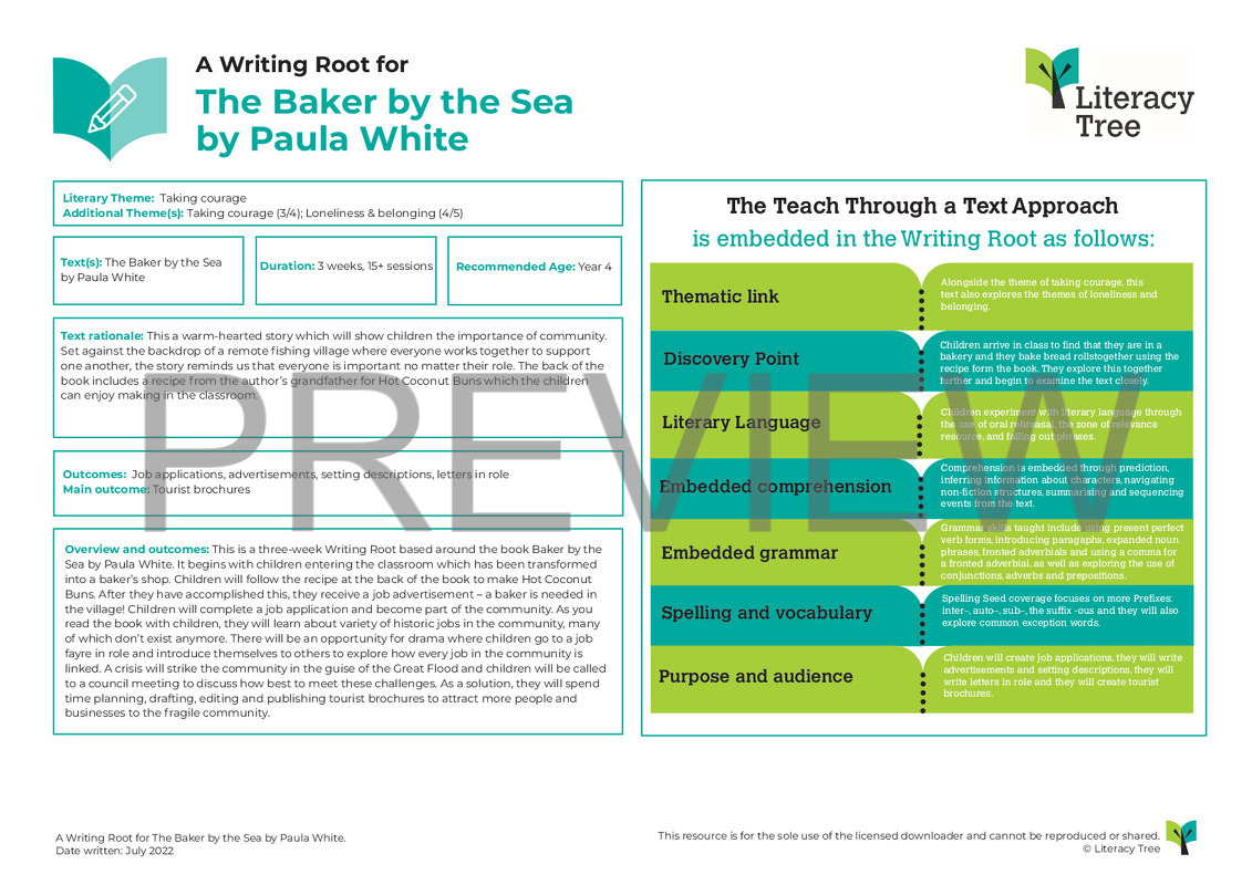 This is a three-week Writing Root based around the book Baker by the Sea by Paula White. It begins with children entering the classroom which has been transformed into a baker’s shop. Children will follow the recipe at the back of the book to make Hot Coconut Buns. After they have accomplished this, they receive a job advertisement – a baker is needed in the village! Children will complete a job application and become part of the community. As you read the book with children, they will learn about variety of historic jobs in the community, many of which don’t exist anymore. There will be an opportunity for drama where children go to a job fayre in role and introduce themselves to others to explore how every job in the community is linked. A crisis will strike the community in the guise of the Great Flood and children will be called to a council meeting to discuss how best to meet these challenges. As a solution, they will spend time planning, drafting, editing and publishing tourist brochures to attract more people and businesses to the fragile community.