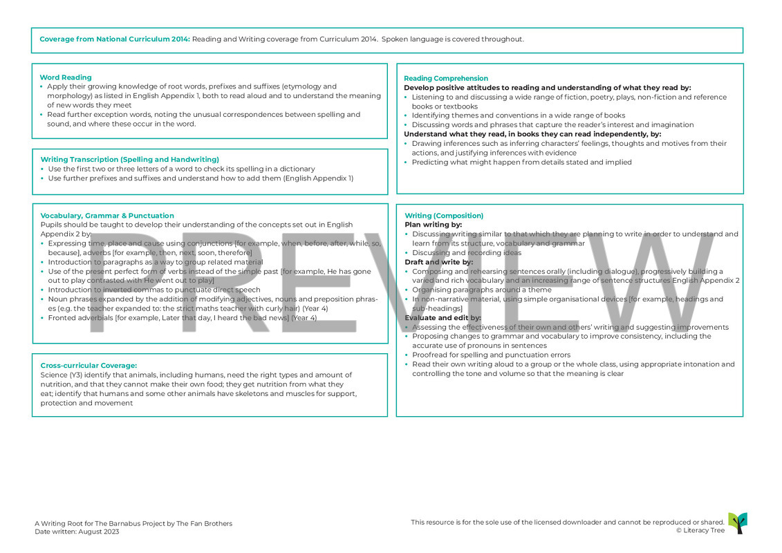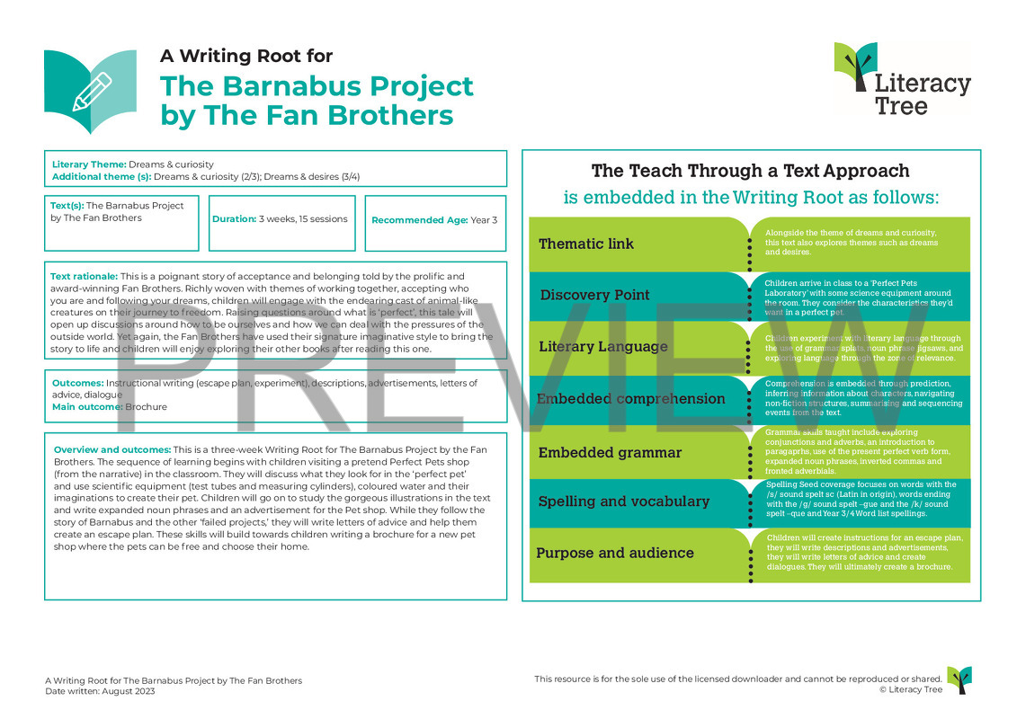 This is a three-week Writing Root for The Barnabus Project by the Fan Brothers. The sequence of learning begins with children visiting a pretend Perfect Pets shop (from the narrative) in the classroom. They will discuss what they look for in the ‘perfect pet’ and use scientific equipment (test tubes and measuring cylinders), coloured water and their imaginations to create their pet. Children will go on to study the gorgeous illustrations in the text and write expanded noun phrases and an advertisement for the Pet shop. While they follow the story of Barnabus and the other ‘failed projects,’ they will write letters of advice and help them create an escape plan. These skills will build towards children writing a brochure for a new pet shop where the pets can be free and choose their home.