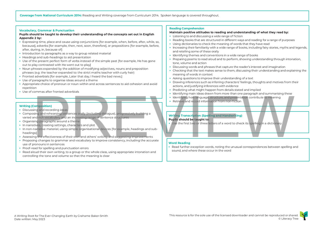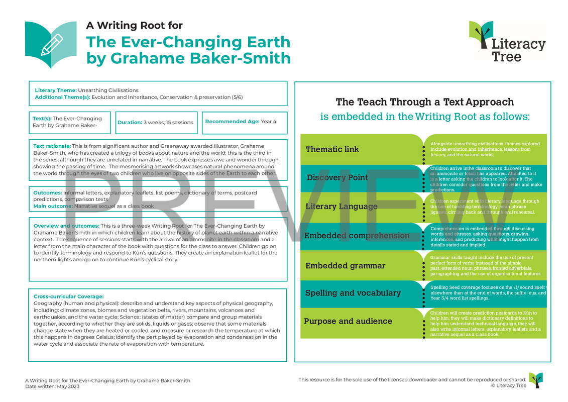 This is a three-week Writing Root for The Ever-Changing Earth by Grahame Baker-Smith in which children learn about the history of planet earth within a narrative context. The sequence of sessions starts with the arrival of an ammonite in the classroom and a letter from the main character of the book with questions for the class to answer. Children go on to identify terminology and respond to Kûn’s questions. They create an explanation leaflet for the Northern Lights and go on to continue Kûn’s cyclical story.