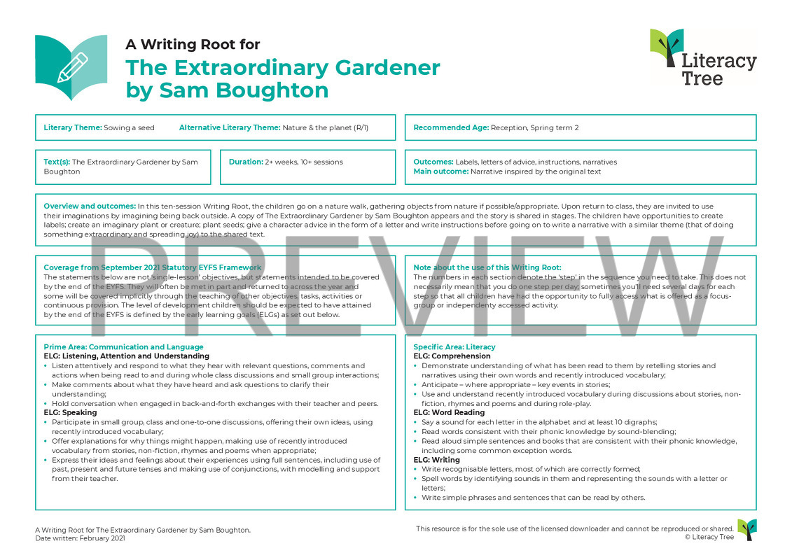 In this ten-session Writing Root, the children go on a nature walk, gathering objects from nature if possible/appropriate. Upon return to class, they are invited to use their imaginations by imagining being back outside. A copy of The Extraordinary Gardener by Sam Boughton appears and the story is shared in stages. The children have opportunities to create labels; create an imaginary plant or creature; plant seeds; give a character advice in the form of a letter and write instructions before going on to write a narrative with a similar theme (that of doing something extraordinary and spreading joy) to the shared text.