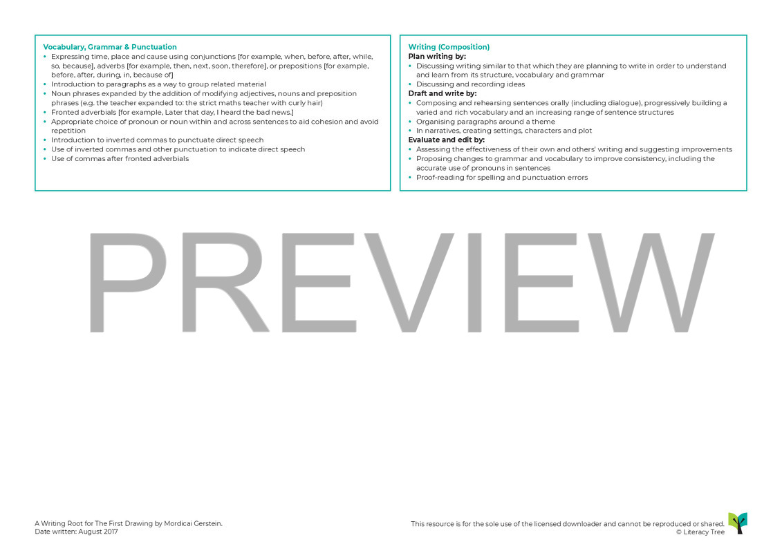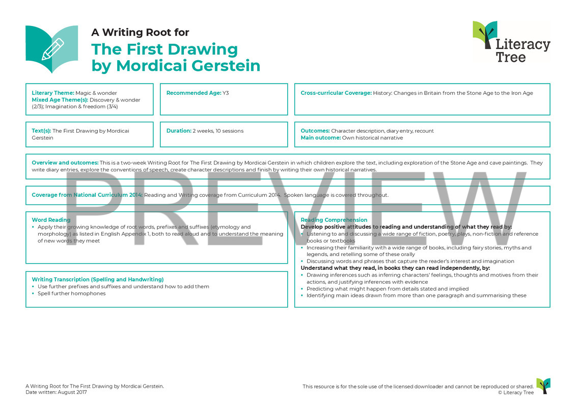 This is a two-week Writing Root for The First Drawing by Mordicai Gerstein in which children explore the text, including exploration of the Stone Age and cave paintings. They write diary entries, explore the conventions of speech, create character descriptions and finish by writing their own historical narratives.