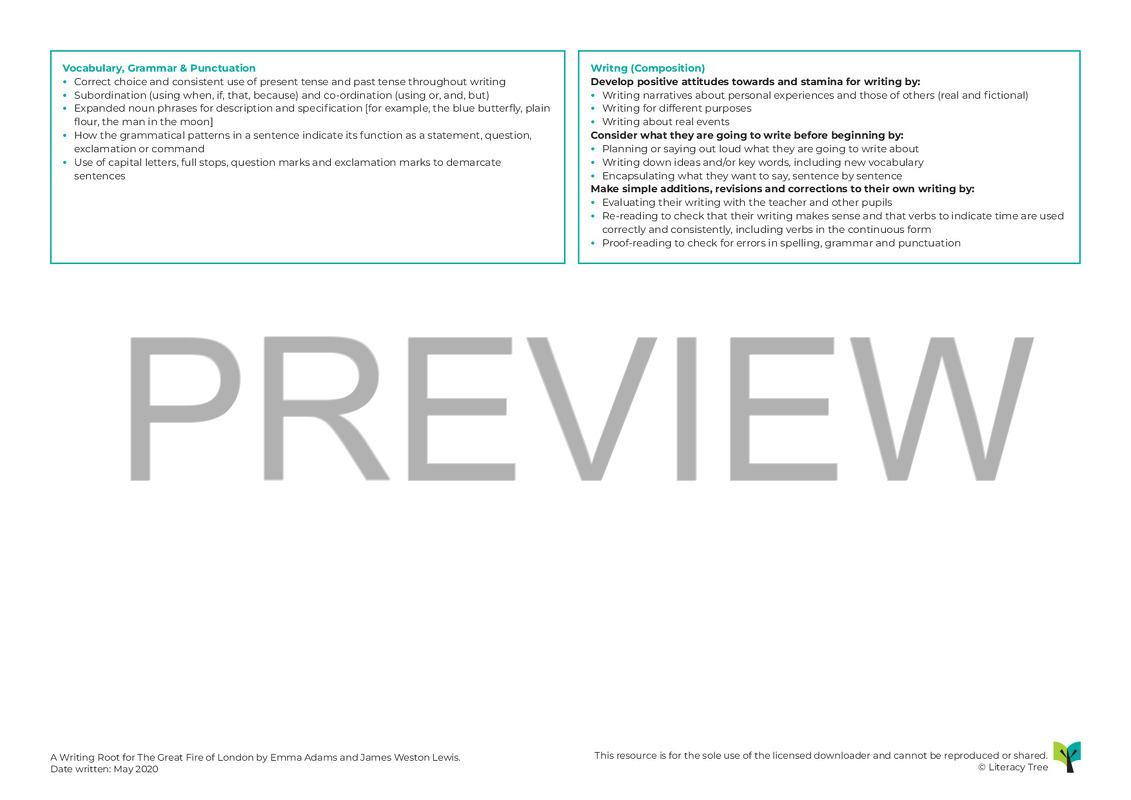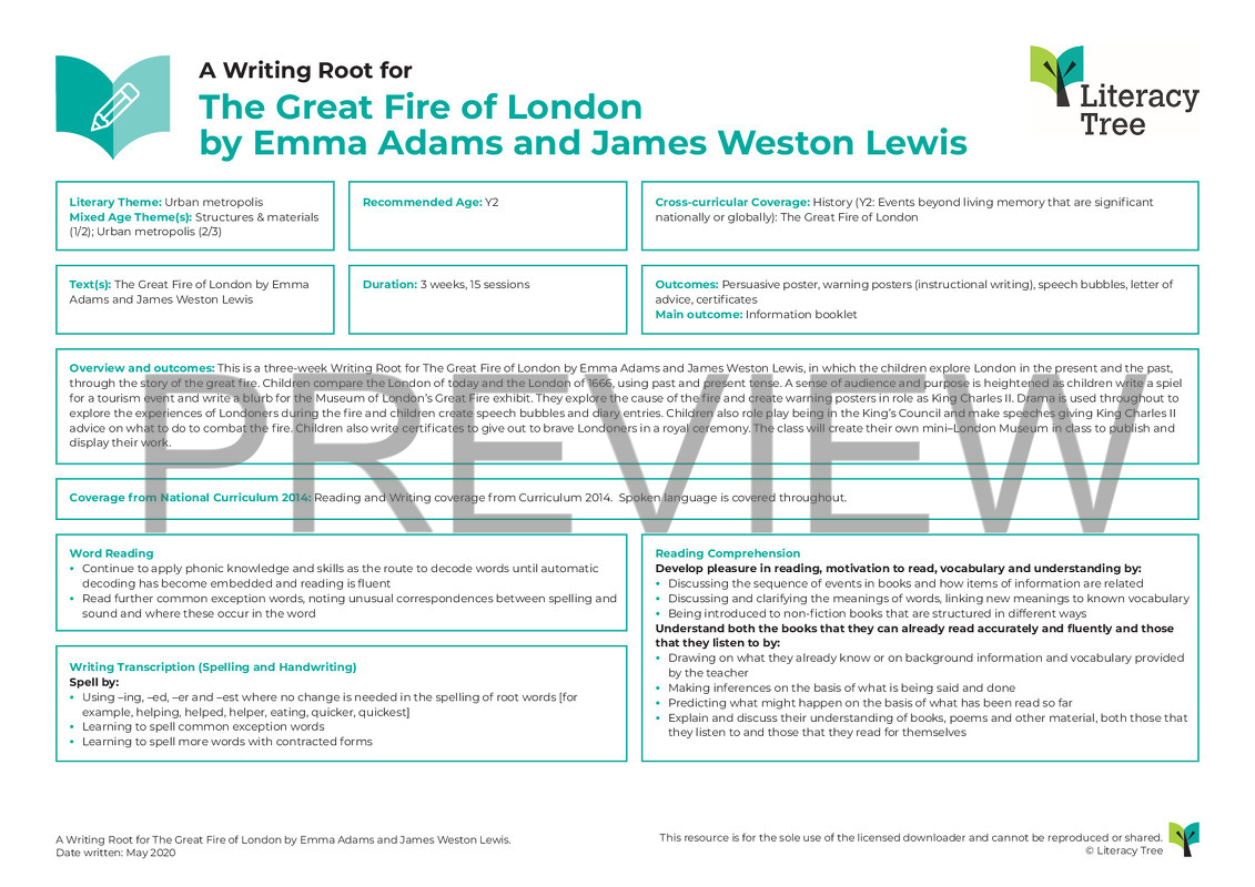 This is a three-week Writing Root for The Great Fire of London by Emma Adams and James Weston Lewis, in which the children explore London in the present and the past, through the story of the great fire. Children compare the London of today and the London of 1666, using past and present tense. A sense of audience and purpose is heightened as children write a spiel for a tourism event and write a blurb for the Museum of London’s Great Fire exhibit. They explore the cause of the fire and create warning posters in role as King Charles II. Drama is used throughout to explore the experiences of Londoners during the fire and children create speech bubbles and diary entries. Children also role play being in the King’s Council and make speeches giving King Charles II advice on what to do to combat the fire. Children also write certificates to give out to brave Londoners in a royal ceremony. The class will create their own mini–London Museum in class to publish and display their work.