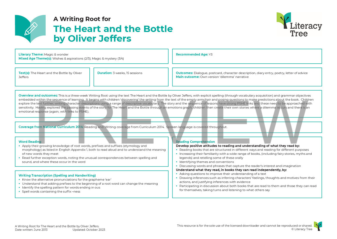 This is a three-week Writing Root using the text The Heart and the Bottle by Oliver Jeffers, with explicit spelling (through vocabulary acquisition) and grammar objectives embedded within the sequence of learning. It begins with children ‘discovering’ the setting from the text of the empty armchair and posing questions to make predictions about the book. Children explore the text further, writing character descriptions using a range of descriptive vocabulary. The story and the sequence of lessons have strong PSHE links and these need to be approached with sensitivity. Having explored the passing events of the story for The Heart and the Bottle through an emotions graph, children then create their own stories where a dilemma occurs and there is an emotional response (again, with links to PSHE).