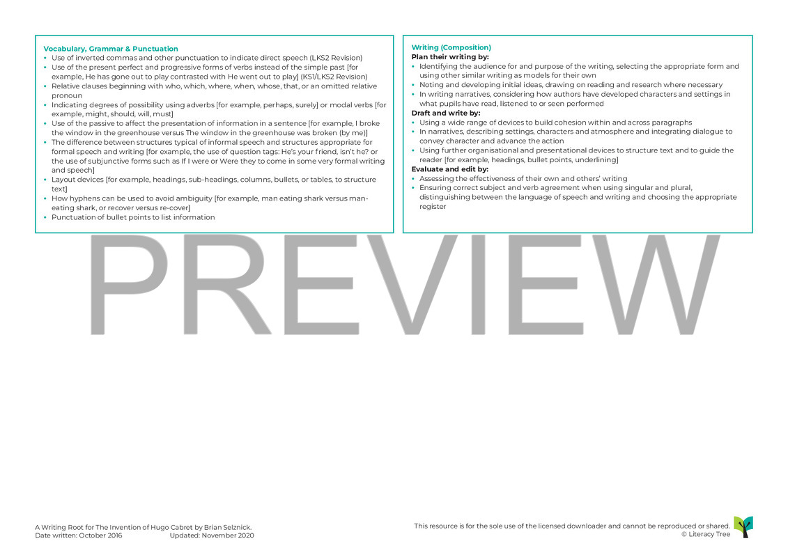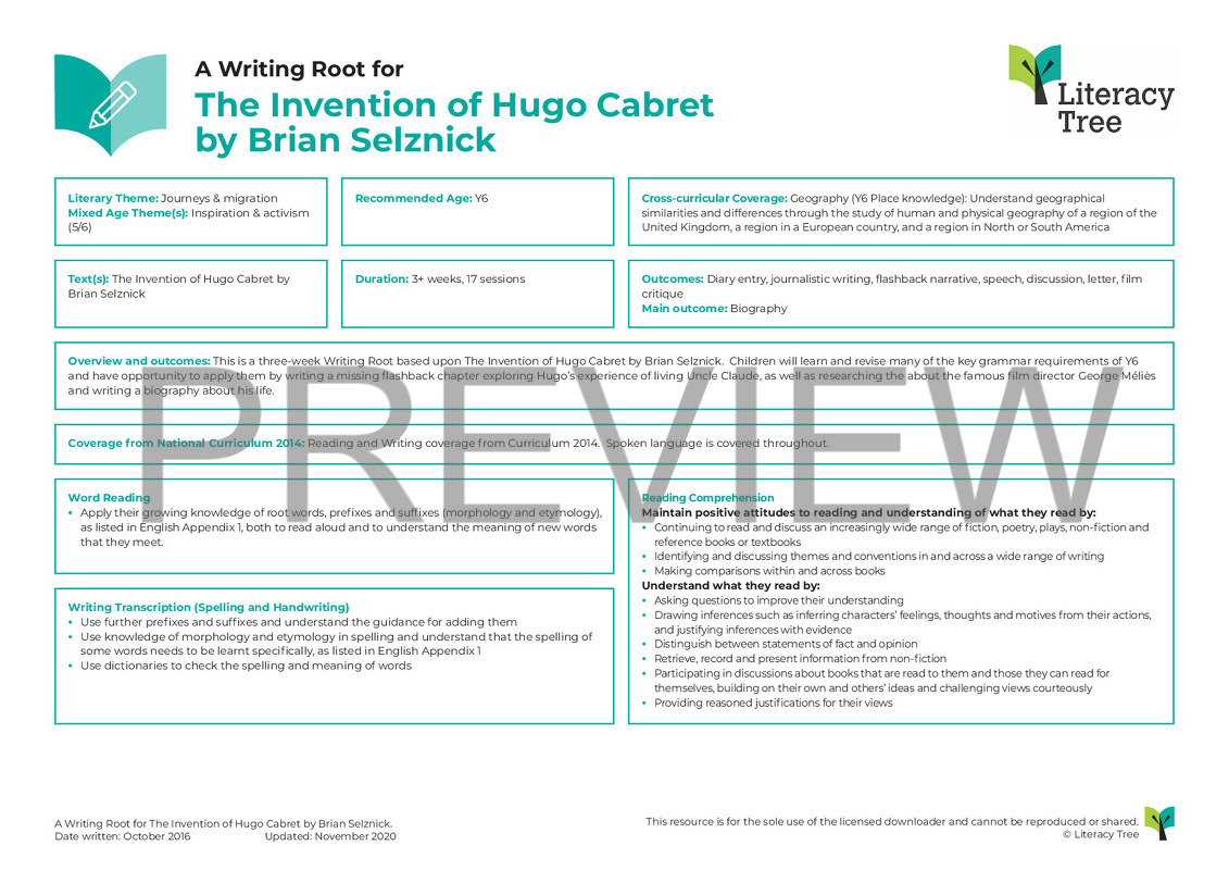 This is a three-week plus Writing Root based upon The Invention of Hugo Cabret by Brian Selznick. Children will use many of the key grammar requirements of Y6 and have opportunity to apply them by writing a missing flashback chapter exploring Hugo’s experience of living Uncle Claude, as well as researching the about the famous film director George Méliès and writing a biography about his life.