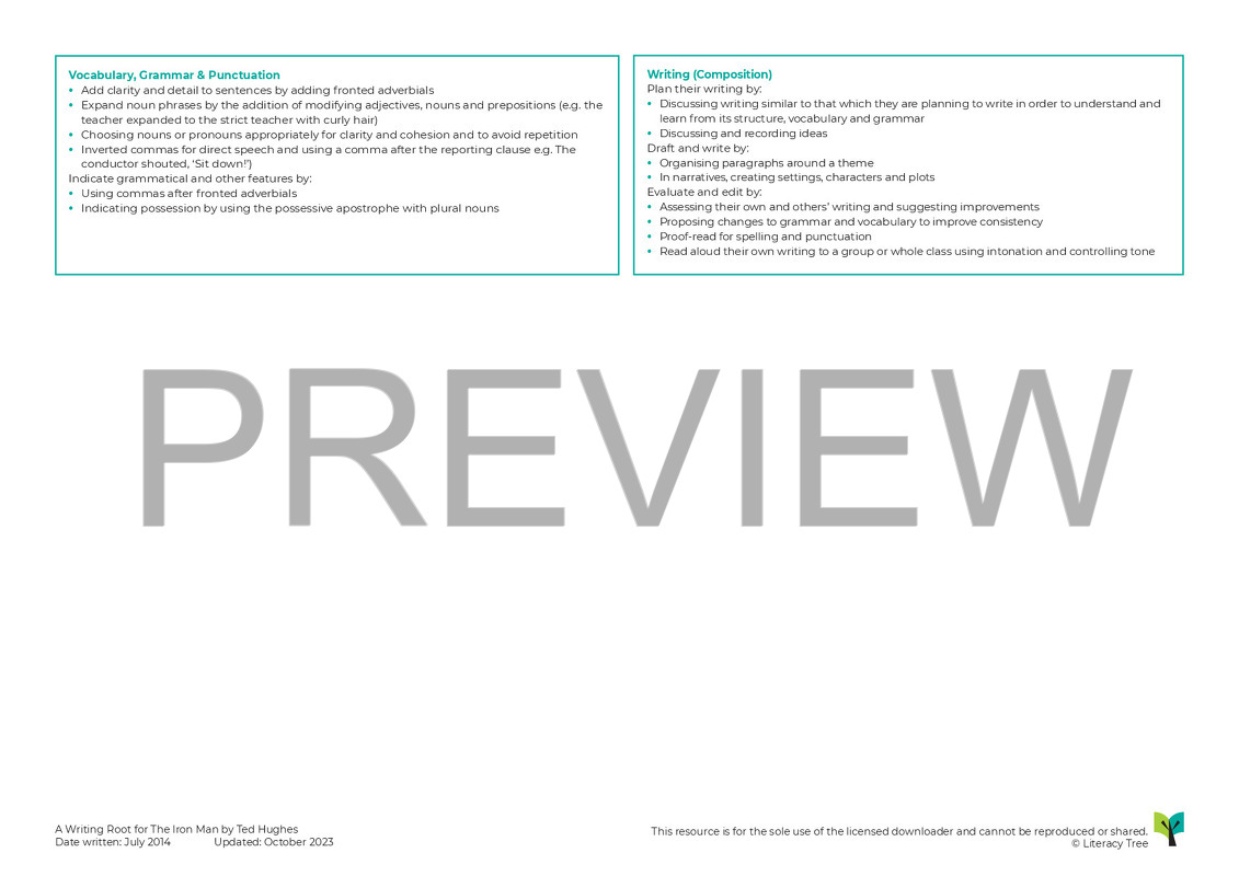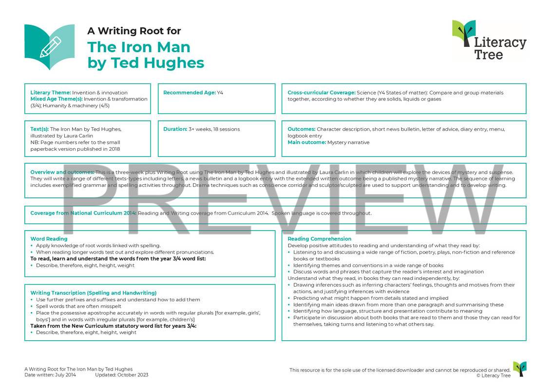 This is a three-week plus Writing Root using The Iron Man by Ted Hughes and illustrated by Laura Carlin in which children will explore the devices of mystery and suspense. They will write a range of different texts-types including letters, a news bulletin and a logbook entry with the extended written outcome being a published mystery narrative. The sequence of learning includes exemplified grammar and spelling activities throughout. Drama techniques such as conscience corridor and sculptor/sculpted are used to support understanding and to develop writing.