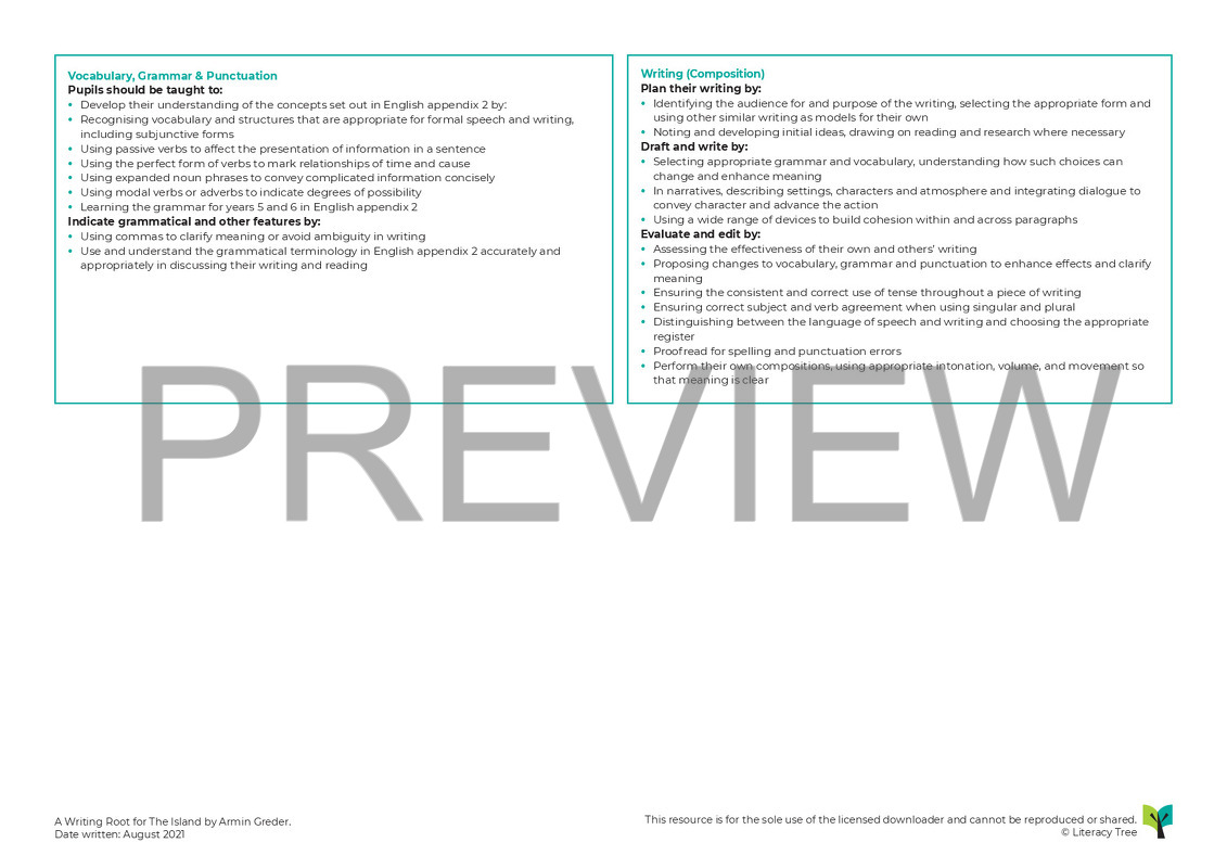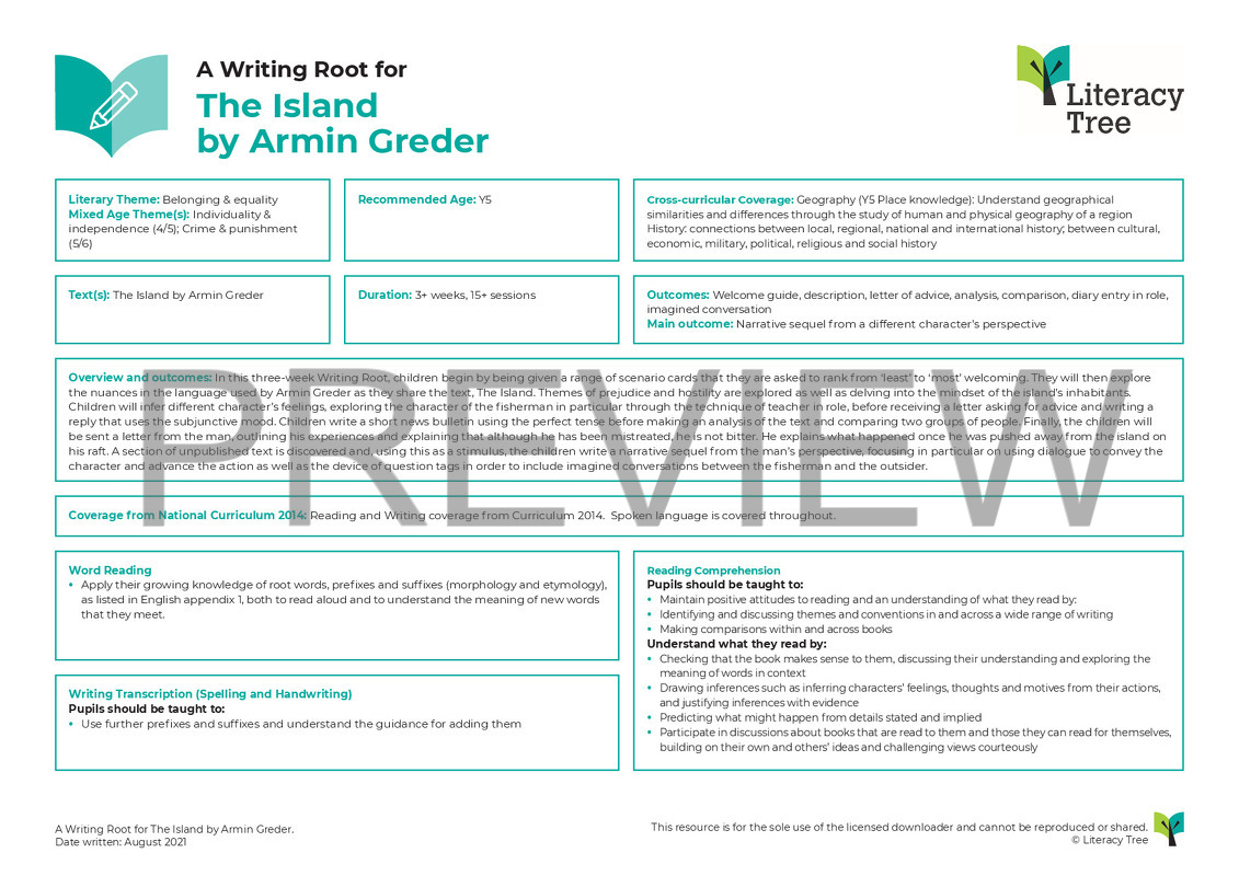 In this three-week Writing Root, children begin by being given a range of scenario cards that they are asked to rank from ‘least’ to ‘most’ welcoming. They will then explore the nuances in the language used by Armin Greder as they share the text, The Island. Themes of prejudice and hostility are explored as well as delving into the mindset of the island’s inhabitants. Children will infer different character’s feelings, exploring the character of the fisherman in particular through the technique of teacher in role, before receiving a letter asking for advice and writing a reply that uses the subjunctive mood. Children write a short news bulletin using the perfect tense before making an analysis of the text and comparing two groups of people. Finally, the children will be sent a letter from the man, outlining his experiences and explaining that although he has been mistreated, he is not bitter. He explains what happened once he was pushed away from the island on his raft. A section of unpublished text is discovered and, using this as a stimulus, the children write a narrative sequel from the man’s perspective, focusing in particular on using dialogue to convey the character and advance the action as well as the device of question tags in order to include imagined conversations between the fisherman and the outsider.