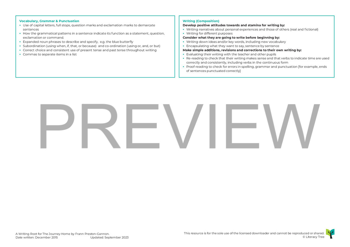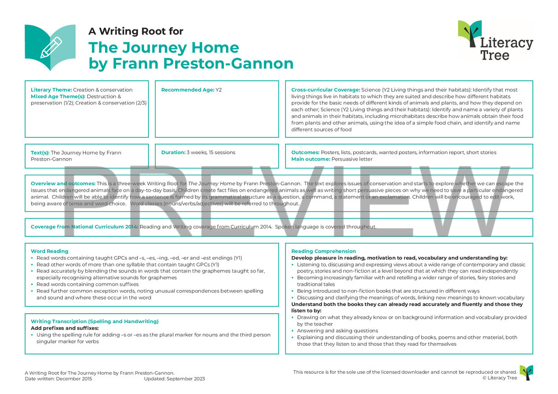 This is a three-week Writing Root for The Journey Home by Frann Preston-Gannon. The text explores issues of conservation and starts to explore whether we can escape the issues that endangered animals face on a day-to-day basis. Children create fact files on endangered animals as well writing short persuasive pieces on why we need to save a particular endangered animal. Children will be able to identify how a sentence is formed by its grammatical structure as a question, a command, a statement or an exclamation. Children will be encouraged to edit work, being aware of tense and word choice. Word classes (nouns/verbs/adjectives) will be referred to throughout.