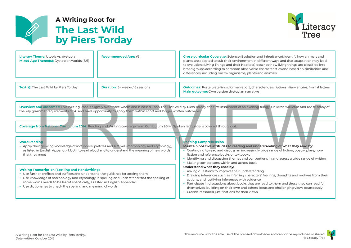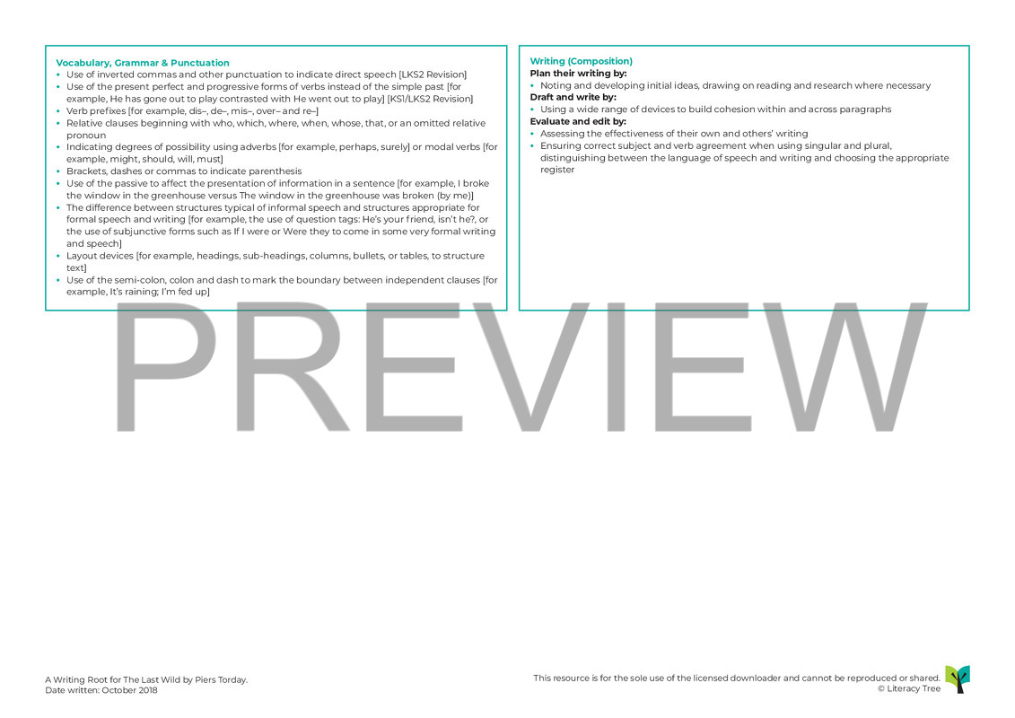 This Writing Root is slightly over three weeks and is based upon The Last Wild by Piers Torday, the first instalment of an exciting trilogy. Children will learn and revise many of the key grammar requirements of Y6 and have opportunity to apply them within short and longer written outcomes.