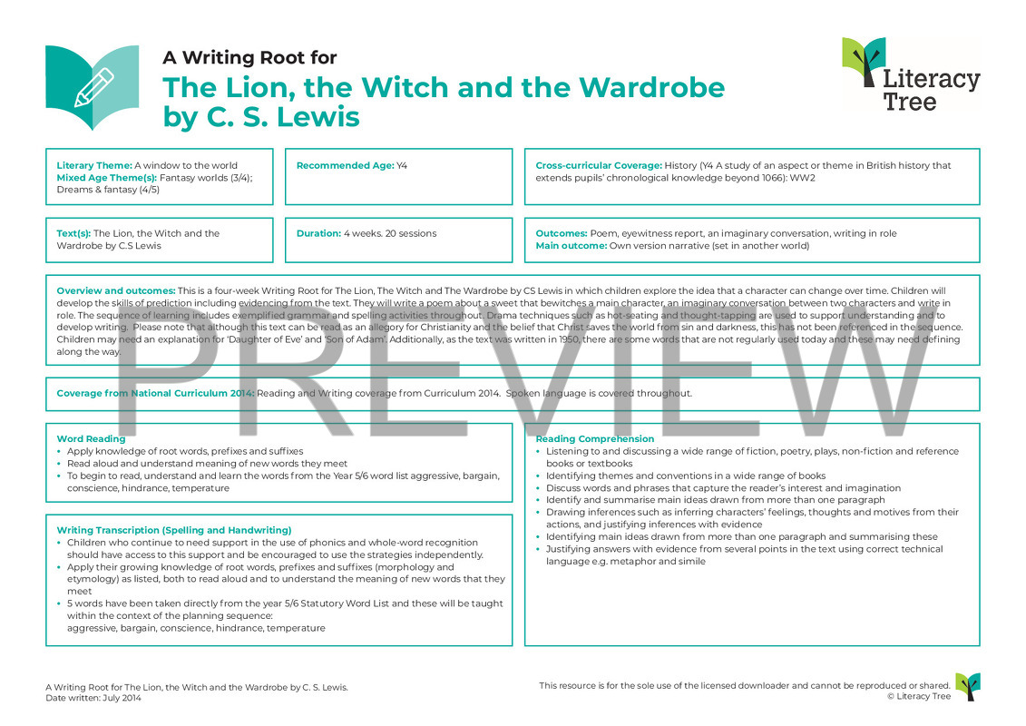 This is a four-week Writing Root for The Lion, The Witch and The Wardrobe by CS Lewis in which children explore the idea that a character can change over time. Children will develop the skills of prediction including evidencing from the text. They will write a poem about a sweet that bewitches a main character, an imaginary conversation between two characters and write in role. The sequence of learning includes exemplified grammar and spelling activities throughout. Drama techniques such as hot-seating and thought-tapping are used to support understanding and to develop writing. Please note that although this text can be read as an allegory for Christianity and the belief that Christ saves the world from sin and darkness, this has not been referenced in the sequence. Children may need an explanation for ‘Daughter of Eve’ and ‘Son of Adam’. Additionally, as the text was written in 1950, there are some words that are not regularly used today and these may need defining along the way.