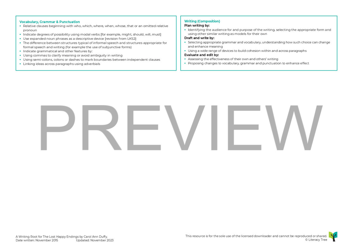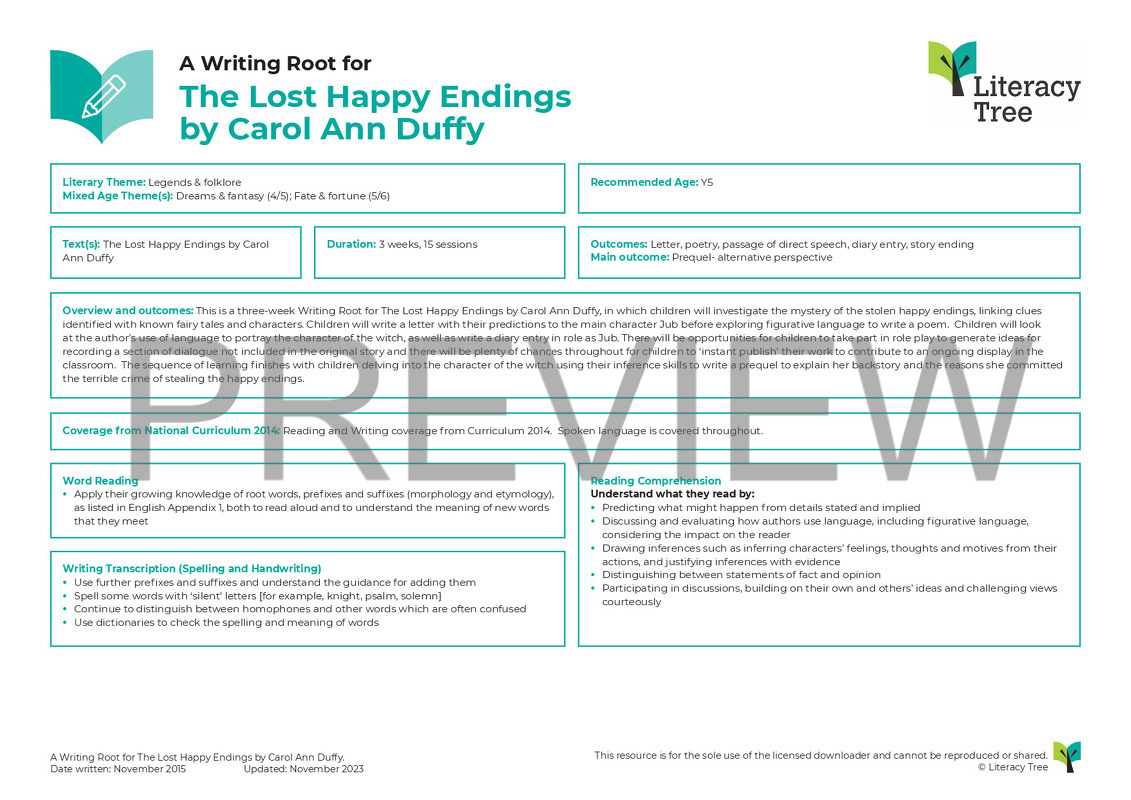 This is a three-week Writing Root for The Lost Happy Endings by Carol Ann Duffy, in which children will investigate the mystery of the stolen happy endings, linking clues identified with known fairy tales and characters. Children will write a letter with their predictions to the main character Jub before exploring figurative language to write a poem. Children will look at the author’s use of language to portray the character of the witch, as well as write a diary entry in role as Jub. There will be opportunities for children to take part in role play to generate ideas for recording a section of dialogue not included in the original story and there will be plenty of chances throughout for children to ‘instant publish’ their work to contribute to an ongoing display in the classroom. The sequence of learning finishes with children delving into the character of the witch using their inference skills to write a prequel to explain her backstory and the reasons she committed the terrible crime of stealing the happy endings.