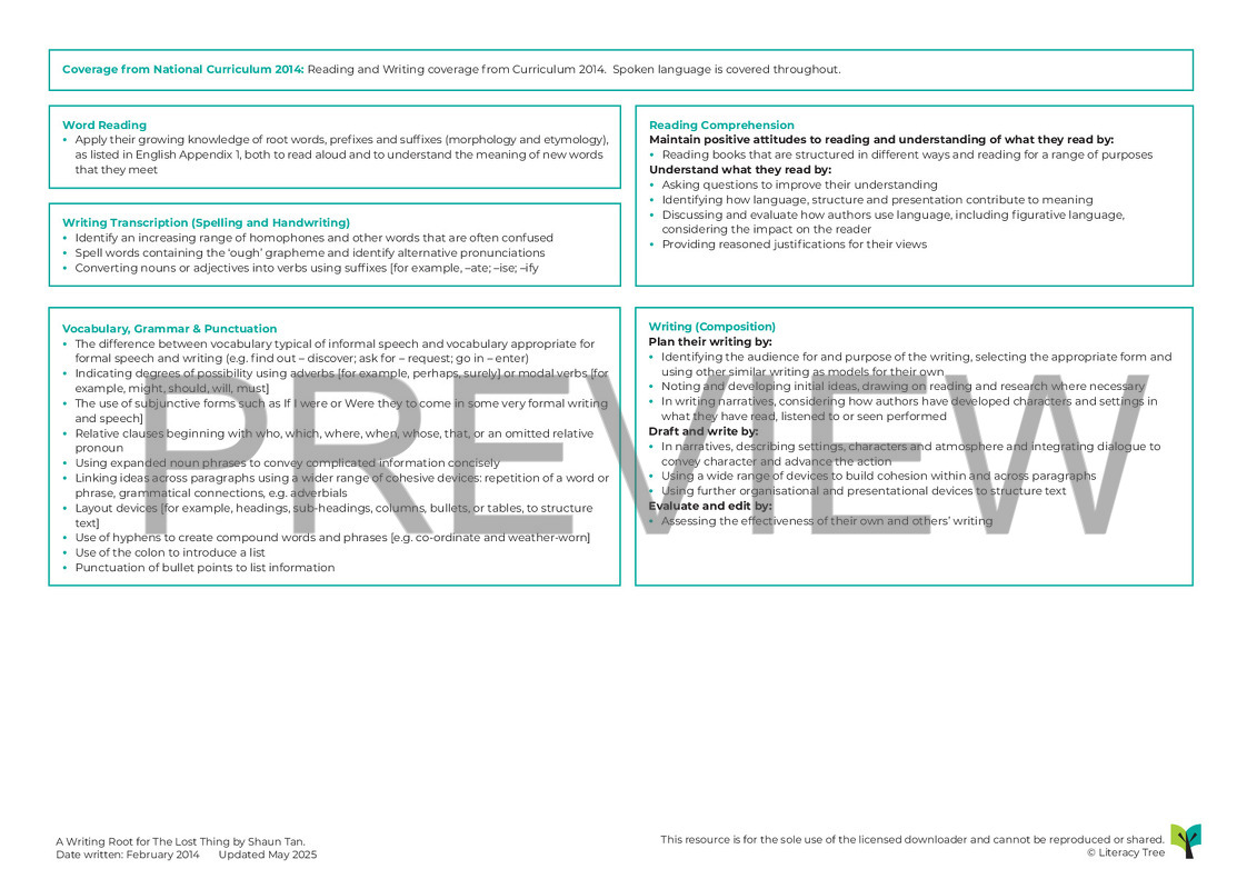 Using the film and text of Shaun Tan’s The Lost Thing, children initially engage with the themes of the story and make predictions about its content. They then engage with the story through writing diary entries in role and writing formal letters of advice to Pete about what he should do. They go on to create guides for how to look after it along with completing official paperwork and adverts for the Department of Odds and Ends. Children will then go on to design their own lost thing and describe it in order to incorporate it into their own version of a ‘lost thing’ narrative.