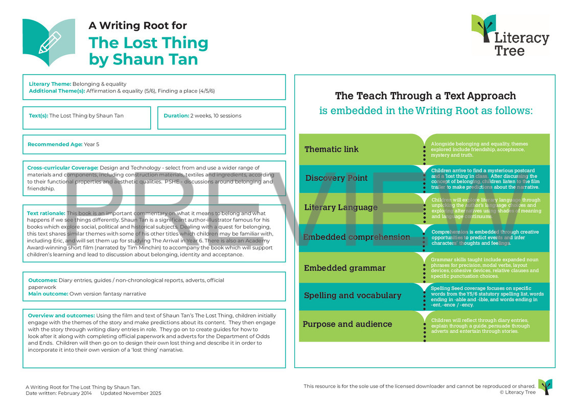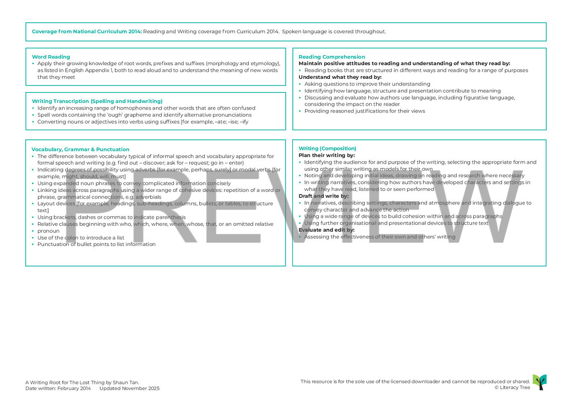 Using the film and text of Shaun Tan’s The Lost Thing, children initially engage with the themes of the story and make predictions about its content. They then engage with the story through writing diary entries in role and writing formal letters of advice to Pete about what he should do. They go on to create guides for how to look after it along with completing official paperwork and adverts for the Department of Odds and Ends. Children will then go on to design their own lost thing and describe it in order to incorporate it into their own version of a ‘lost thing’ narrative.
