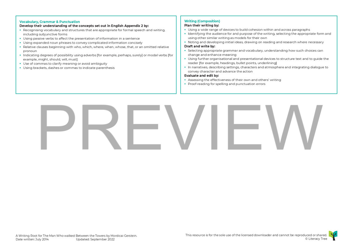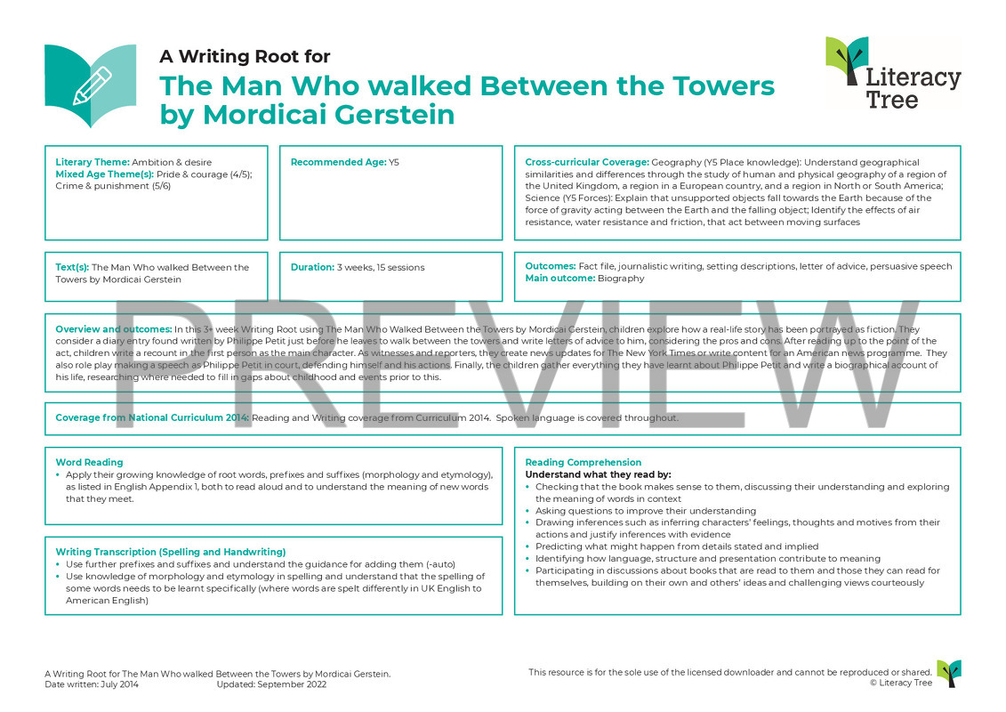 In this 3+ week Writing Root using The Man Who Walked Between the Towers by Mordicai Gerstein, children explore how a real-life story has been portrayed as fiction. They consider a diary entry found written by Philippe Petit just before he leaves to walk between the towers and write letters of advice to him, considering the pros and cons. After reading up to the point of the act, children write a recount in the first person as the main character. As witnesses and reporters, they create news updates for The New York Times or write content for an American news programme. They also role play making a speech as Philippe Petit in court, defending himself and his actions. Finally, the children gather everything they have learnt about Philippe Petit and write a biographical account of his life, researching where needed to fill in gaps about childhood and events prior to this.