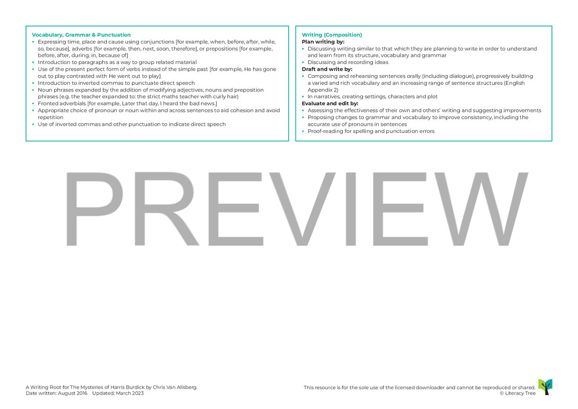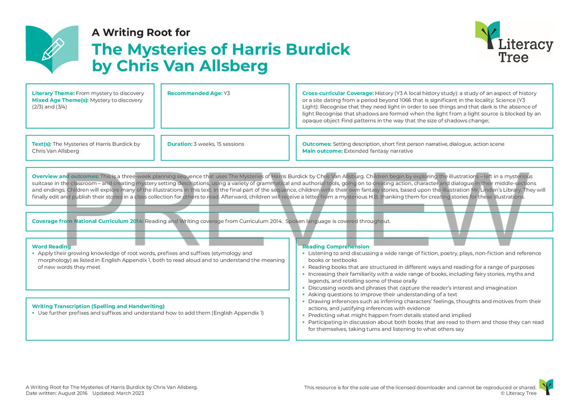 This is a three-week Writing Root which uses The Mysteries of Harris Burdick by Chris Van Allsburg. Children begin by exploring the illustrations – left in a mysterious suitcase in the classroom – and creating mystery setting descriptions, using a variety of grammatical and authorial tools. They go on to create action, character and dialogue in their middle-sections and endings. Children will explore many of the illustrations in this text. In the final part of the Writing Root, children write their own fantasy stories, based upon the illustration Mr. Linden’s Library. They will finally edit and publish their stories in a class collection for others to read. Afterwards, children will receive a letter from a mysterious H.B. thanking them for creating stories for these illustrations.