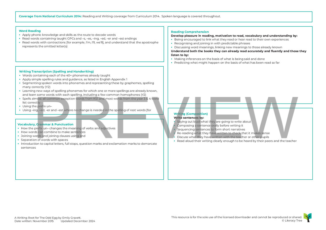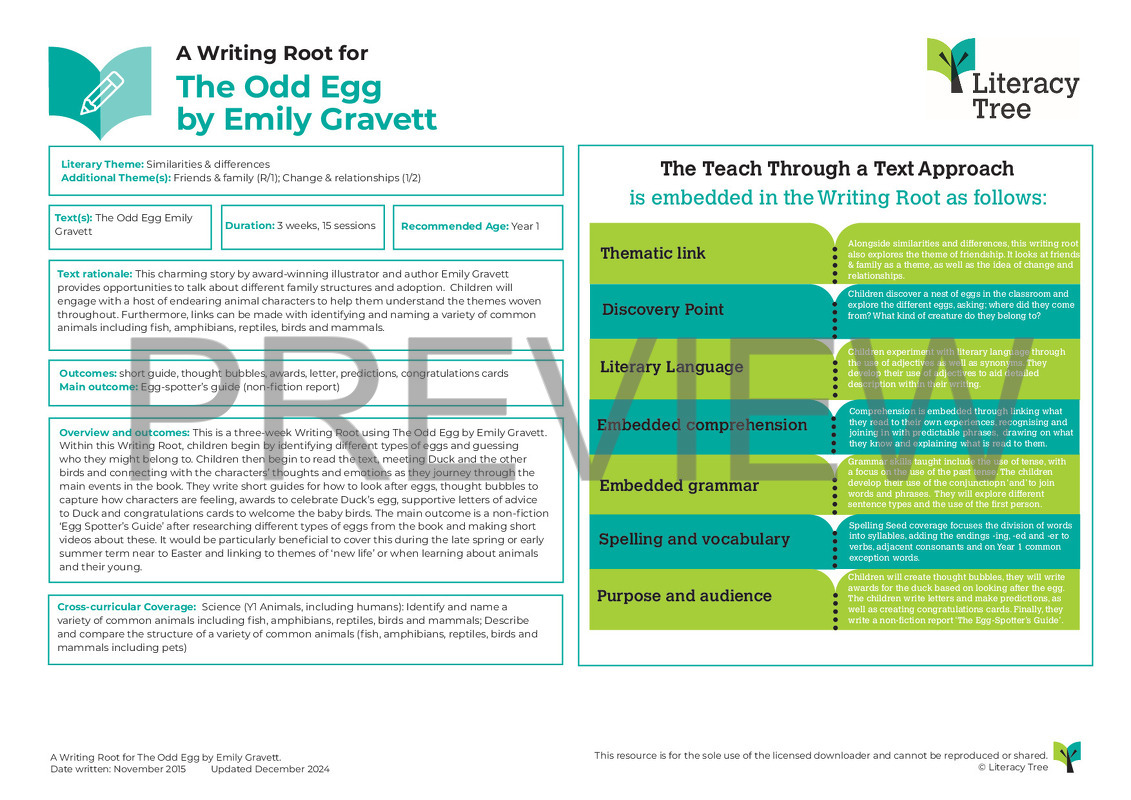 This is a three-week Writing Root using The Odd Egg by Emily Gravett. Within this Writing Root, children begin by identifying different types of eggs and guessing who they might belong to. Children then begin to read the text, meeting Duck and the other birds and connecting with the characters’ thoughts and emotions as they journey through the main events in the book. They write short guides for how to look after eggs, thought bubbles to capture how characters are feeling, awards to celebrate Duck’s egg, supportive letters of advice to Duck and congratulations cards to welcome the baby birds. The main outcome is a non-fiction ‘Egg Spotter’s Guide’ after researching different types of eggs from the book and making short videos about these. It would be particularly beneficial to cover this during the late spring or early summer term near to Easter and linking to themes of ‘new life’ or when learning about animals and their young.