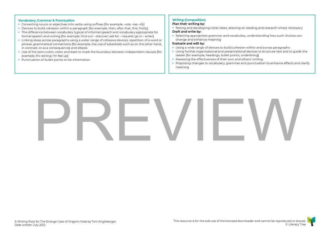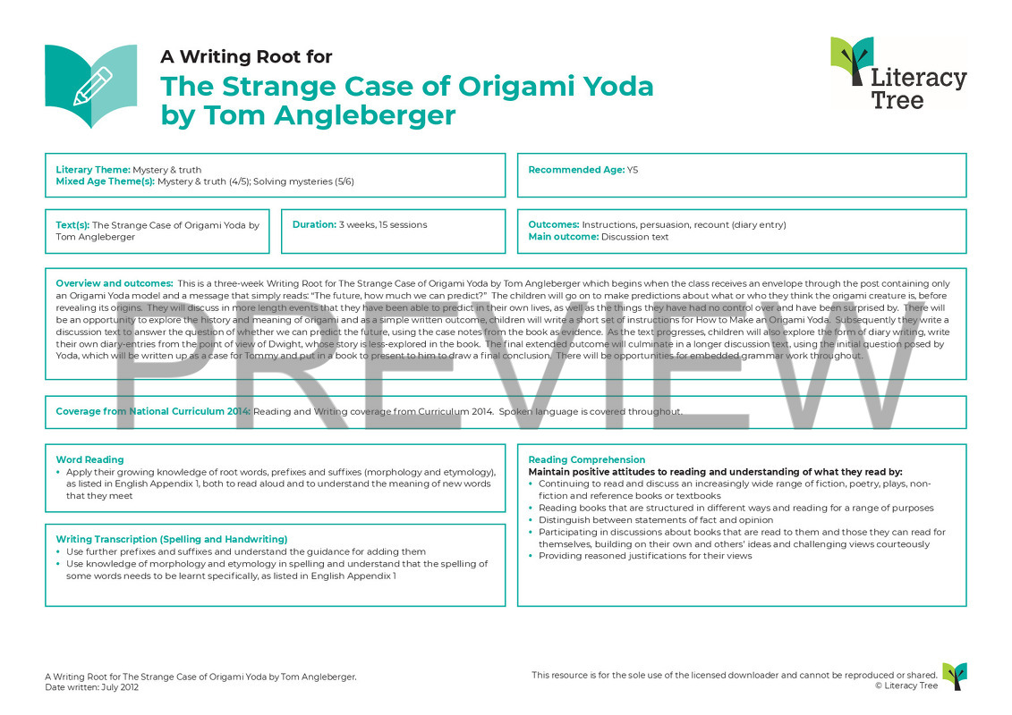 This is a three-week Writing Root for The Strange Case of Origami Yoda by Tom Angleberger which begins when the class receives an envelope through the post containing only an Origami Yoda model and a message that simply reads: “The future, how much we can predict?” The children will go on to make predictions about what or who they think the origami creature is, before revealing its origins. They will discuss in more length events that they have been able to predict in their own lives, as well as the things they have had no control over and have been surprised by. There will be an opportunity to explore the history and meaning of origami and as a simple written outcome, children will write a short set of instructions for How to Make an Origami Yoda. Subsequently they write a discussion text to answer the question of whether we can predict the future, using the case notes from the book as evidence. As the text progresses, children will also explore the form of diary writing, write their own diary-entries from the point of view of Dwight, whose story is less-explored in the book. The final extended outcome will culminate in a longer discussion text, using the initial question posed by Yoda, which will be written up as a case for Tommy and put in a book to present to him to draw a final conclusion. There will be opportunities for embedded grammar work throughout.