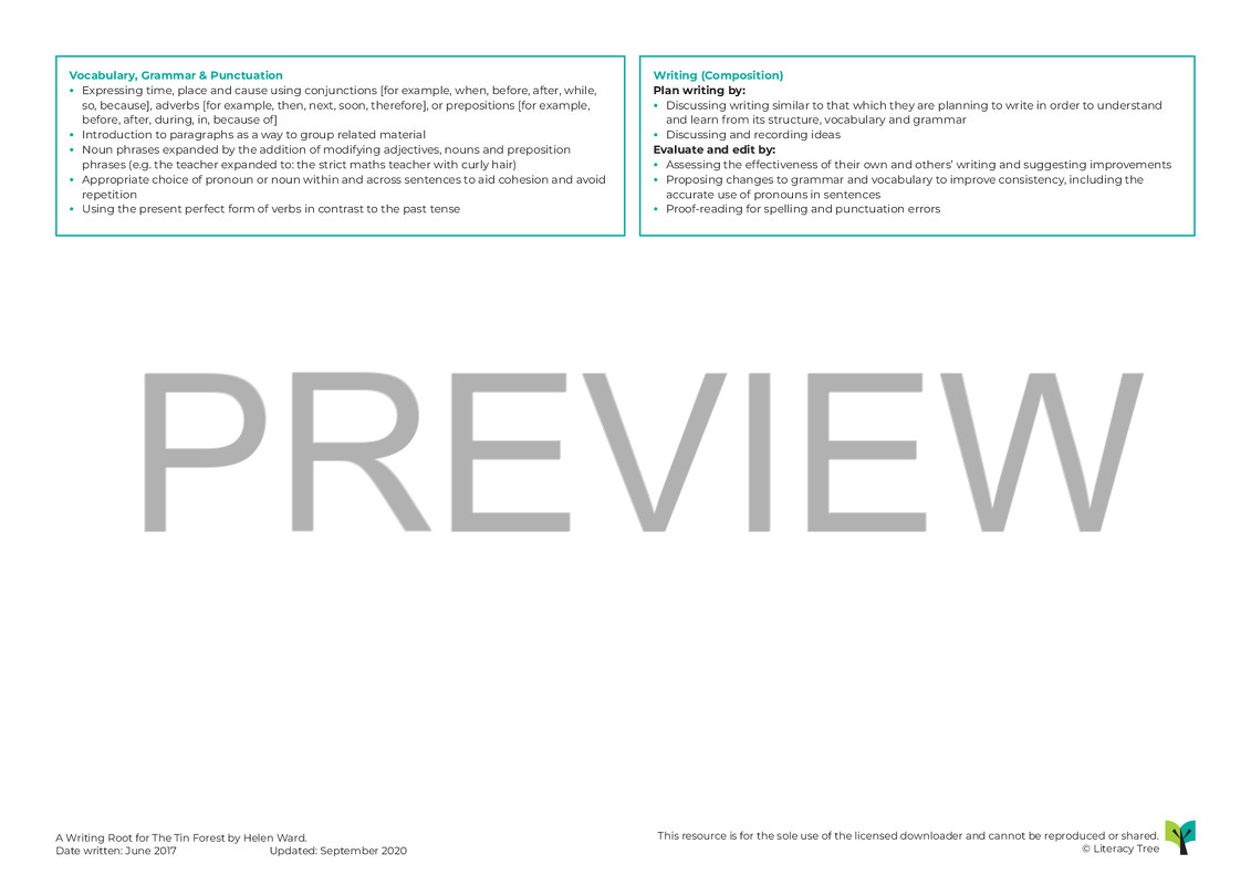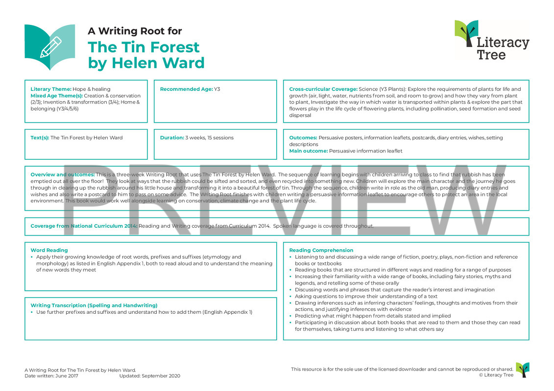 This is a three-week Writing Root that uses The Tin Forest by Helen Ward. The sequence of learning begins with children arriving to class to find that rubbish has been emptied out all over the floor! They look at ways that the rubbish could be sifted and sorted, and even recycled into something new. Children will explore the main character and the journey he goes through in clearing up the rubbish around his little house and transforming it into a beautiful forest of tin. Through the Writing Root, children write in role as the old man, producing diary entries and wishes and also write a postcard to him to pass on some advice. The sequence of learning finishes with children writing a persuasive piece to encourage others to protect an area in the local environment. This book would work well alongside learning on conservation, climate change and the plant life cycle.