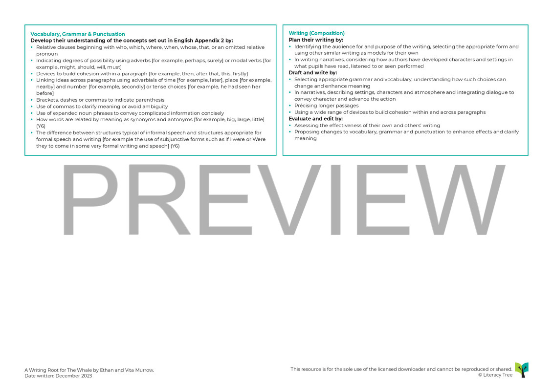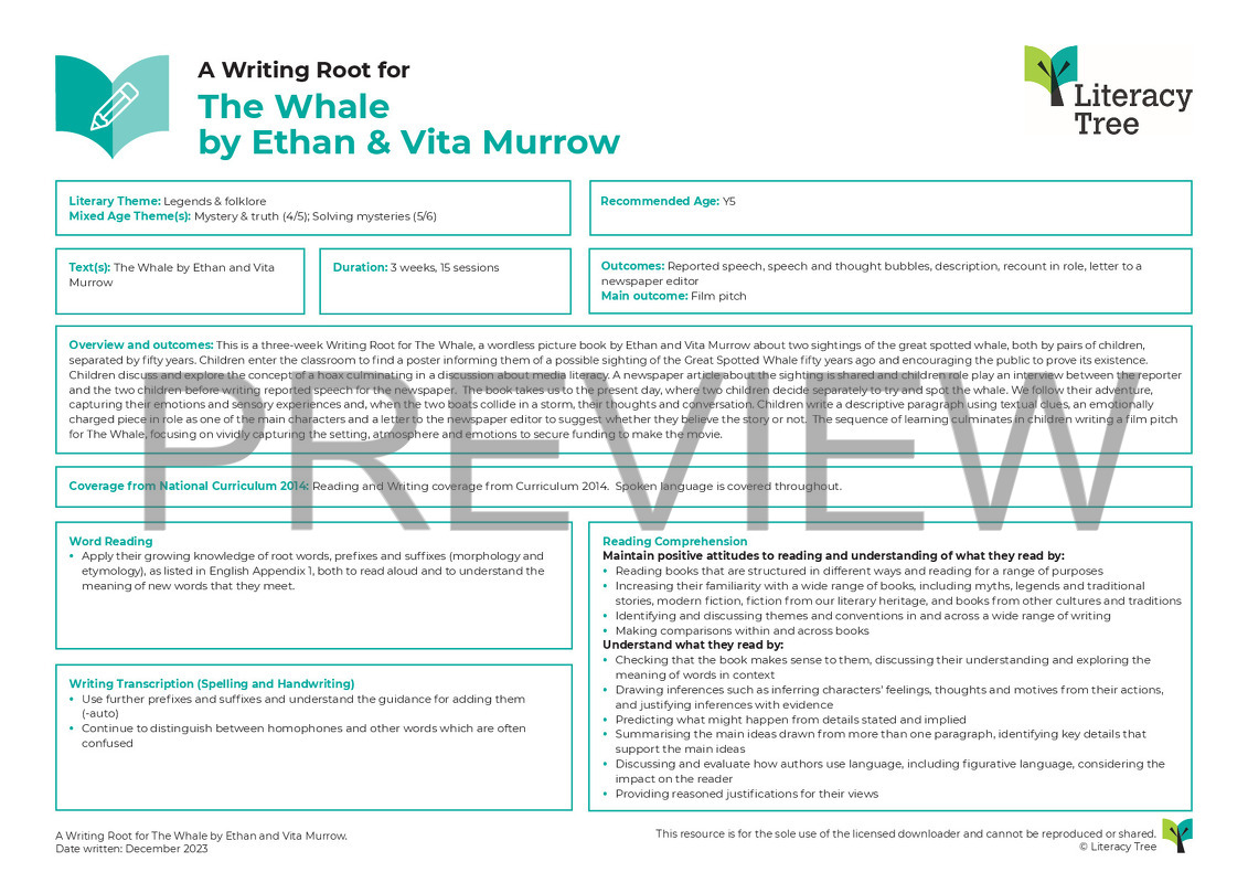 This is a three-week Writing Root for The Whale, a wordless picture book by Ethan and Vita Murrow about two sightings of the great spotted whale, both by pairs of children, separated by fifty years. Children enter the classroom to find a poster informing them of a possible sighting of the Great Spotted Whale fifty years ago and encouraging the public to prove its existence. Children discuss and explore the concept of a hoax culminating in a discussion about media literacy. A newspaper article about the sighting is shared and children role play an interview between the reporter and the two children before writing reported speech for the newspaper. The book takes us to the present day, where two children decide separately to try and spot the whale. We follow their adventure, capturing their emotions and sensory experiences and, when the two boats collide in a storm, their thoughts and conversation. Children write a descriptive paragraph using textual clues, an emotionally charged piece in role as one of the main characters and a letter to the newspaper editor to suggest whether they believe the story or not. The sequence of learning culminates in children writing a film pitch for The Whale, focusing on vividly capturing the setting, atmosphere and emotions to secure funding to make the movie.