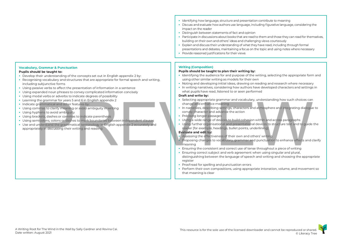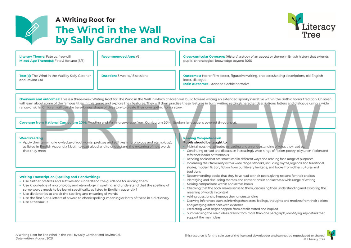This is a three-week Writing Root for The Wind in the Wall in which children will build toward writing an extended spooky narrative within the Gothic horror tradition. Children will learn about some of the famous titles in this genre and explore their features. They will then practise these features in turn, writing setting/character descriptions, letters and dialogue using a wide range of skills. Children will use the bare-bones shape of this story to create their own gothic horror story.