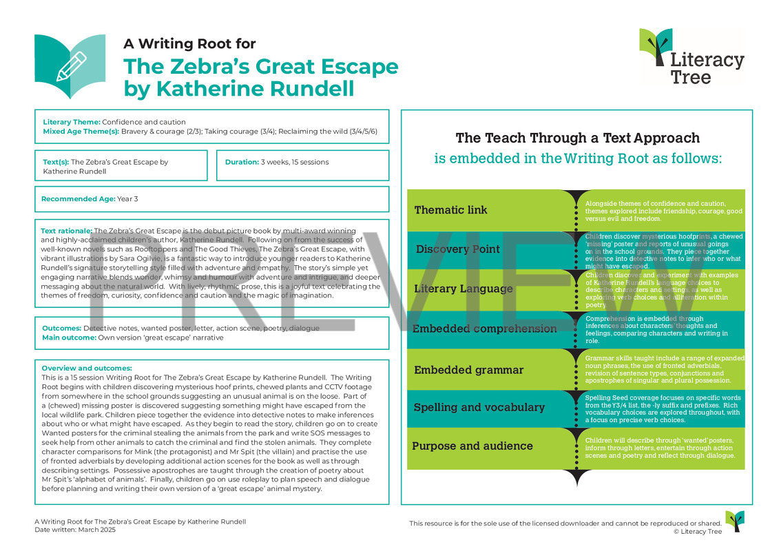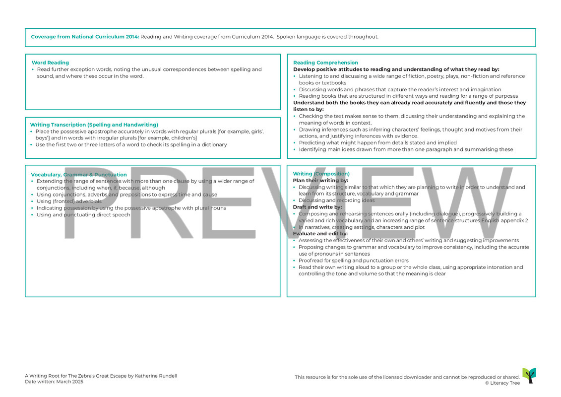 This is a 15 session Writing Root for The Zebra’s Great Escape by Katherine Rundell. The Writing Root begins with children discovering mysterious hoof prints, chewed plants and CCTV footage from somewhere in the school grounds suggesting an unusual animal is on the loose. Part of a (chewed) missing poster is discovered suggesting something might have escaped from the local wildlife park. Children piece together the evidence into detective notes to make inferences about who or what might have escaped. As they begin to read the story, children go on to create Wanted posters for the criminal stealing the animals from the park and write SOS messages to seek help from other animals to catch the criminal and find the stolen animals. They complete character comparisons for Mink (the protagonist) and Mr Spit (the villain) and practise the use of fronted adverbials by developing additional action scenes for the book as well as through describing settings. Possessive apostrophes are taught through the creation of poetry about Mr Spit’s ‘alphabet of animals’. Finally, children go on to use role-play to plan speech and dialogue before planning and writing their own version of a ‘great escape’ animal mystery.