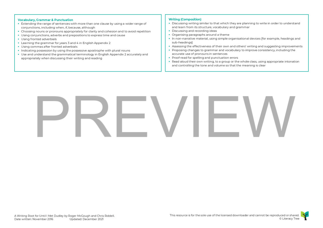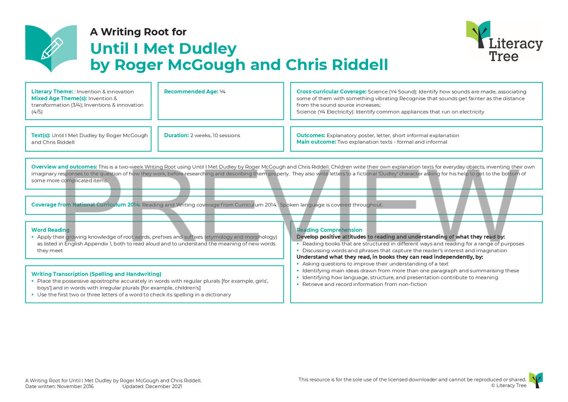 This is a two-week Writing Root using Until I Met Dudley by Roger McGough and Chris Riddell. Children write their own explanation texts for everyday objects, inventing their own imaginary responses to the question of how they work, before researching and describing them properly. They also write letters to a fictional ‘Dudley’ character asking for his help to get to the bottom of some more complicated items.