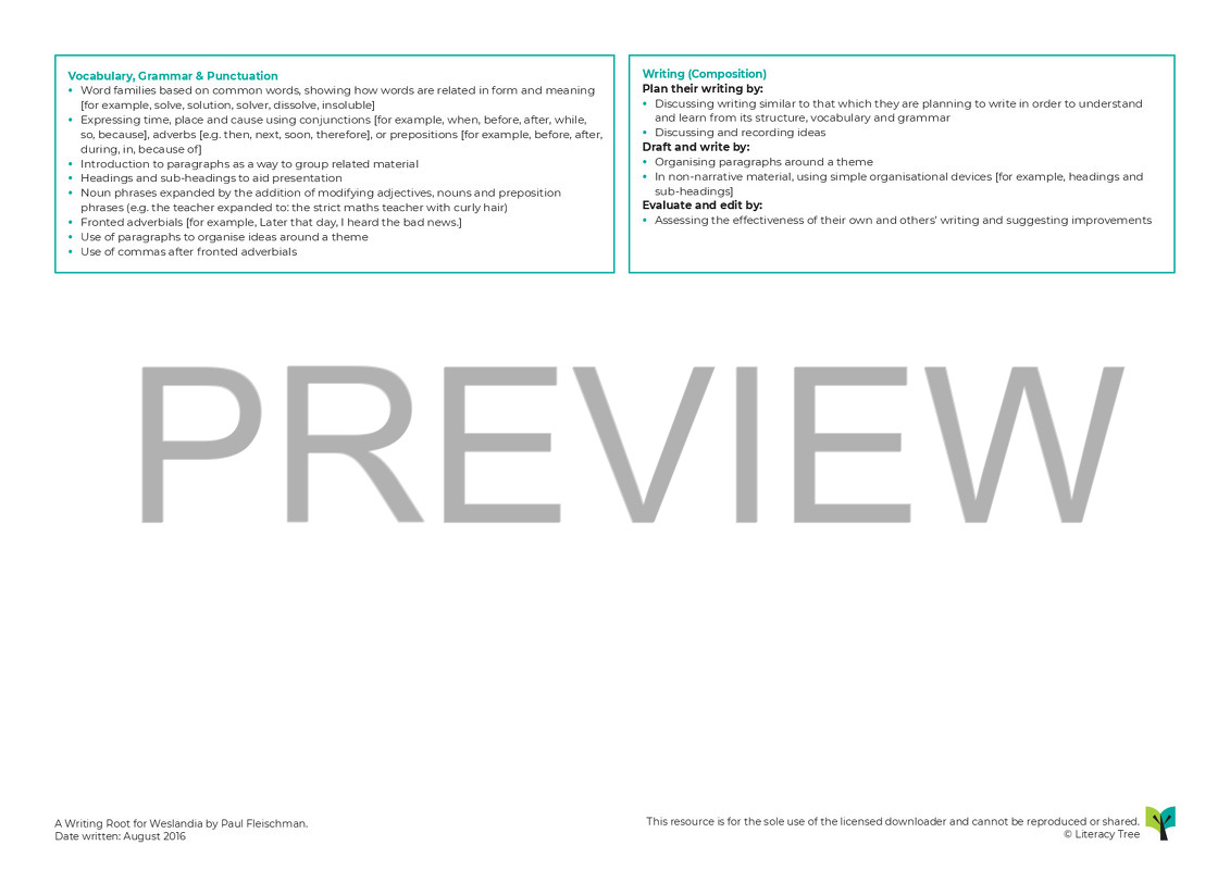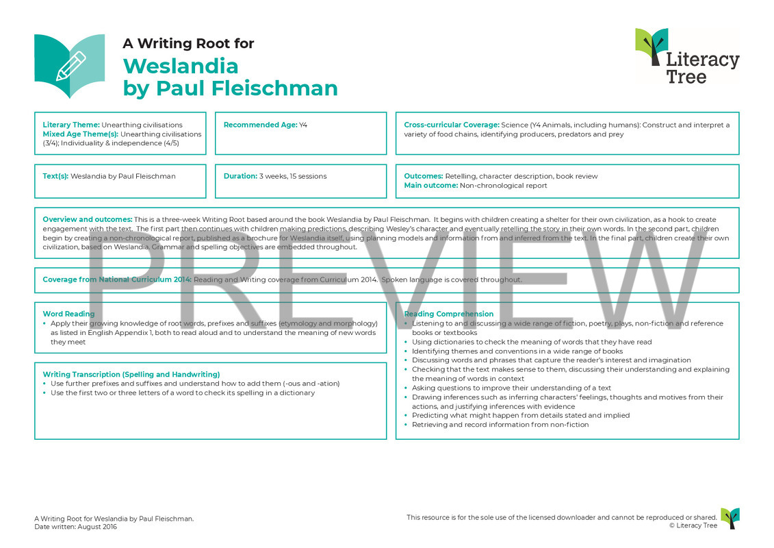 This is a three-week Writing Root based around the book Weslandia by Paul Fleischman. It begins with children creating a shelter for their own civilisation, as a hook to create engagement with the text. The first part then continues with children making predictions, describing Wesley’s character and eventually retelling the story in their own words. In the second part, children begin by creating a non-chronological report, published as a brochure for Weslandia itself, using planning models and information from and inferred from the text. In the final part, children create their own civilisation, based on Weslandia. Grammar and spelling objectives are embedded throughout.