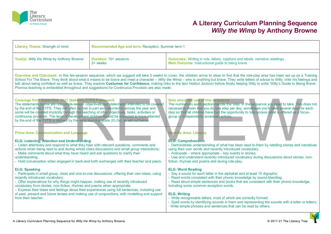 In this ten-session sequence, which we suggest will take 3 weeks to cover, the children arrive to class to find that the role- play area has been set up as a Training School For The Brave. They think about what it means to be brave and meet a character – Willy the Wimp – who is anything but brave. They write letters of advice to Willy, infer his feelings and talk about being confident as well as brave. They explore Costumes for Confidence, making links to the text Halibut Jackson before finally helping Willy to write ‘Willy’s Guide to Being Brave’. Phonics teaching is embedded throughout and suggestions for Continuous Provision are also made.