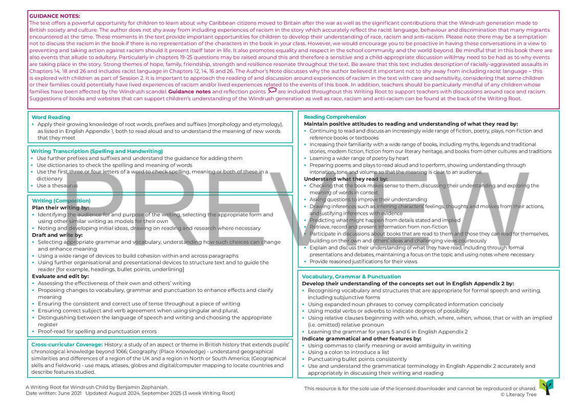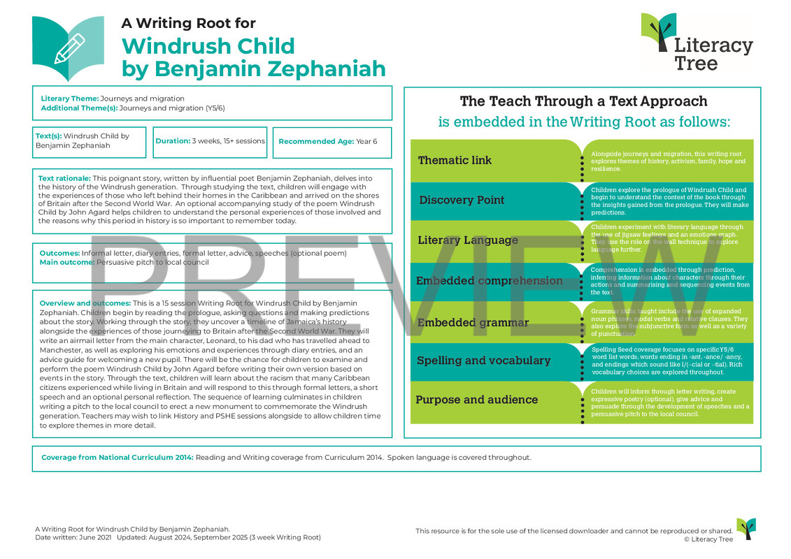 This is a 15-session Writing Root for Windrush Child by Benjamin Zephaniah. Children begin by examining a range of historical evidence relating to HSS Empire Windrush’s arrival in Britain from the Caribbean and consider the motivations of those onboard for coming to the UK. Working through the story, they uncover a timeline of Jamaica’s history alongside the experiences of those journeying to Britain after the Second World War. Children will write an airmail letter from the main character, Leonard, to his dad who has travelled ahead to Manchester, as well as exploring his emotions in a diary entry and a set of advice to other arrivals. There will be the chance for children to examine and perform the poem Windrush Child by John Agard before writing their own version based on events in the story. The sequence of learning culminates in children writing a pitch to the local council to erect a new monument to commemorate the Windrush generation. Teachers may wish to link History and PSHE sessions alongside to allow children time to explore themes in more detail.